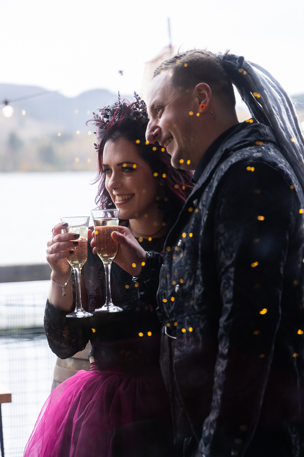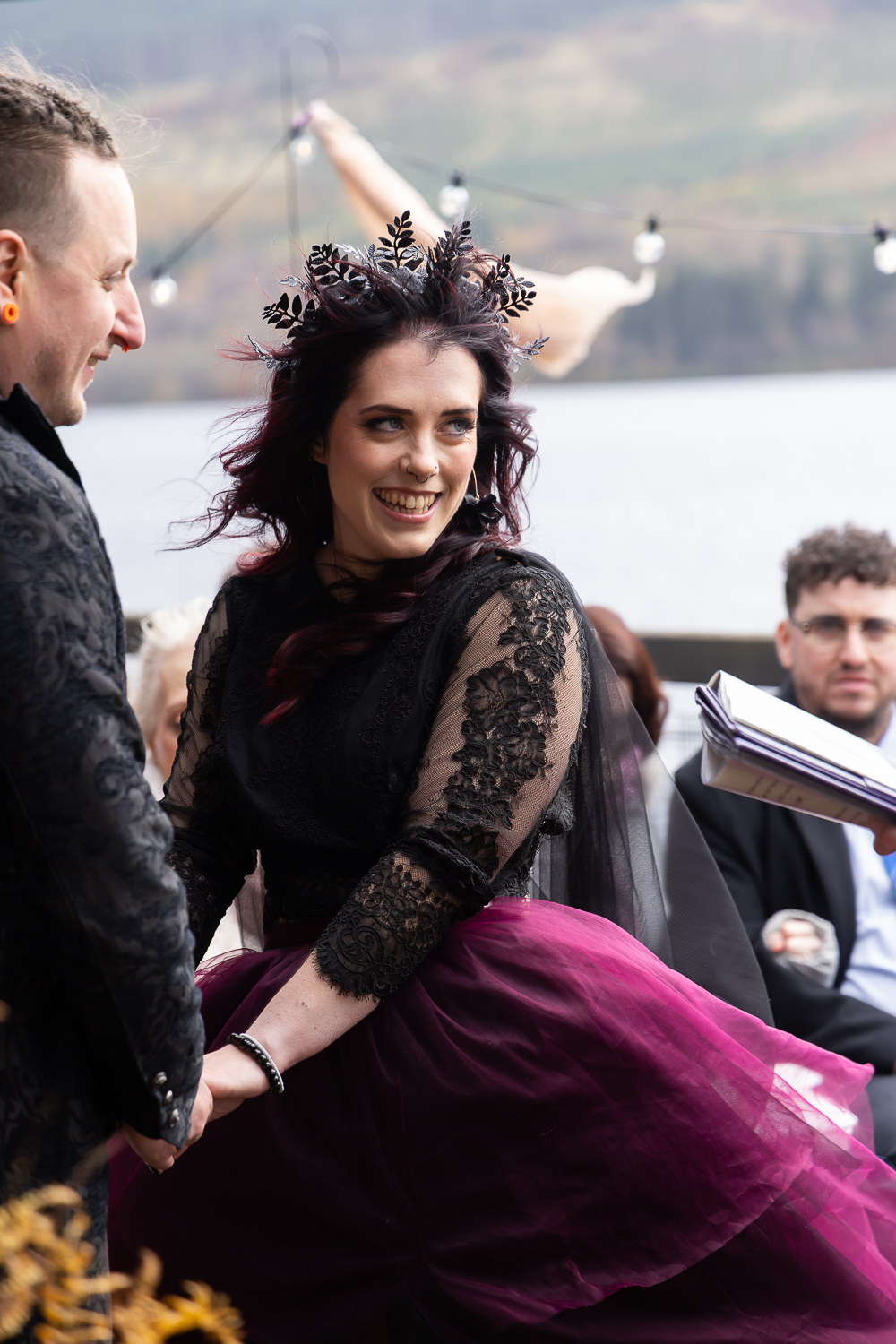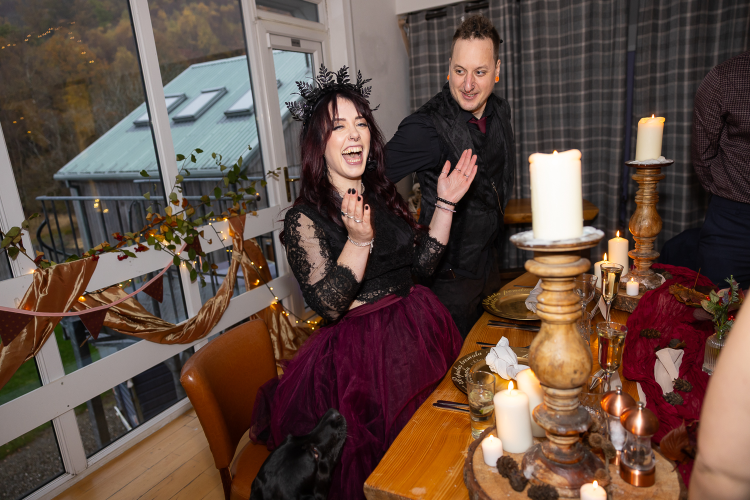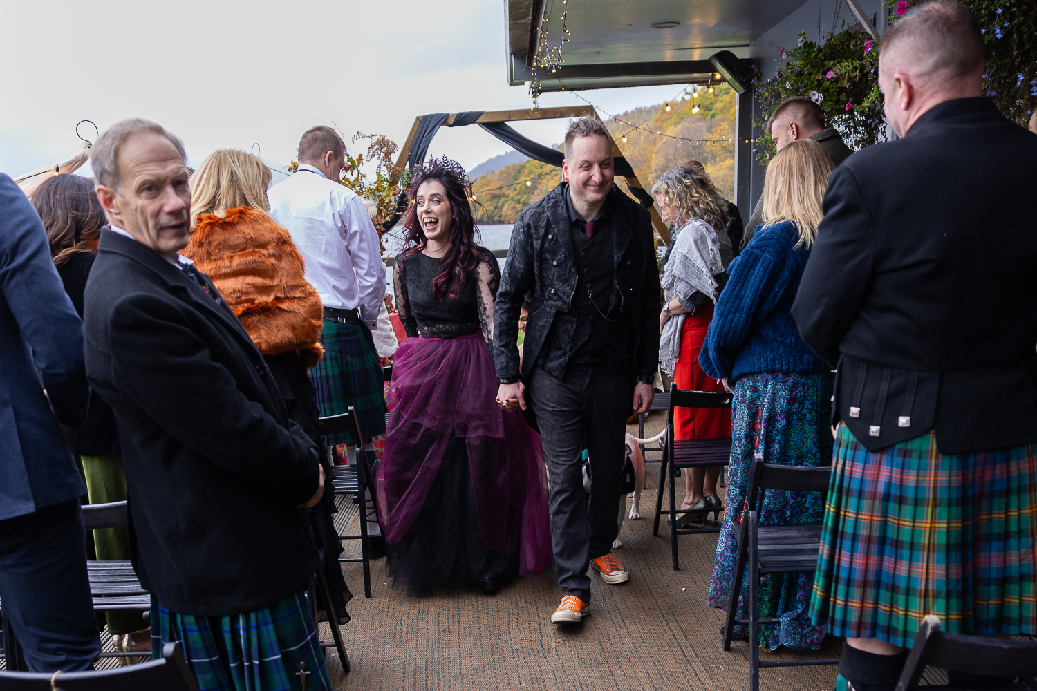 Their ceremony took place on the veranda overlooking Loch Venachar. The weather had that classic Scottish drama; crisp air and strong winds coming across the water but it only added to the energy and emotion of the moment. Meigan’s dress moved beautifully in the wind, Tomas couldn’t stop smiling, and the loch behind them created a constantly shifting backdrop of light and texture.