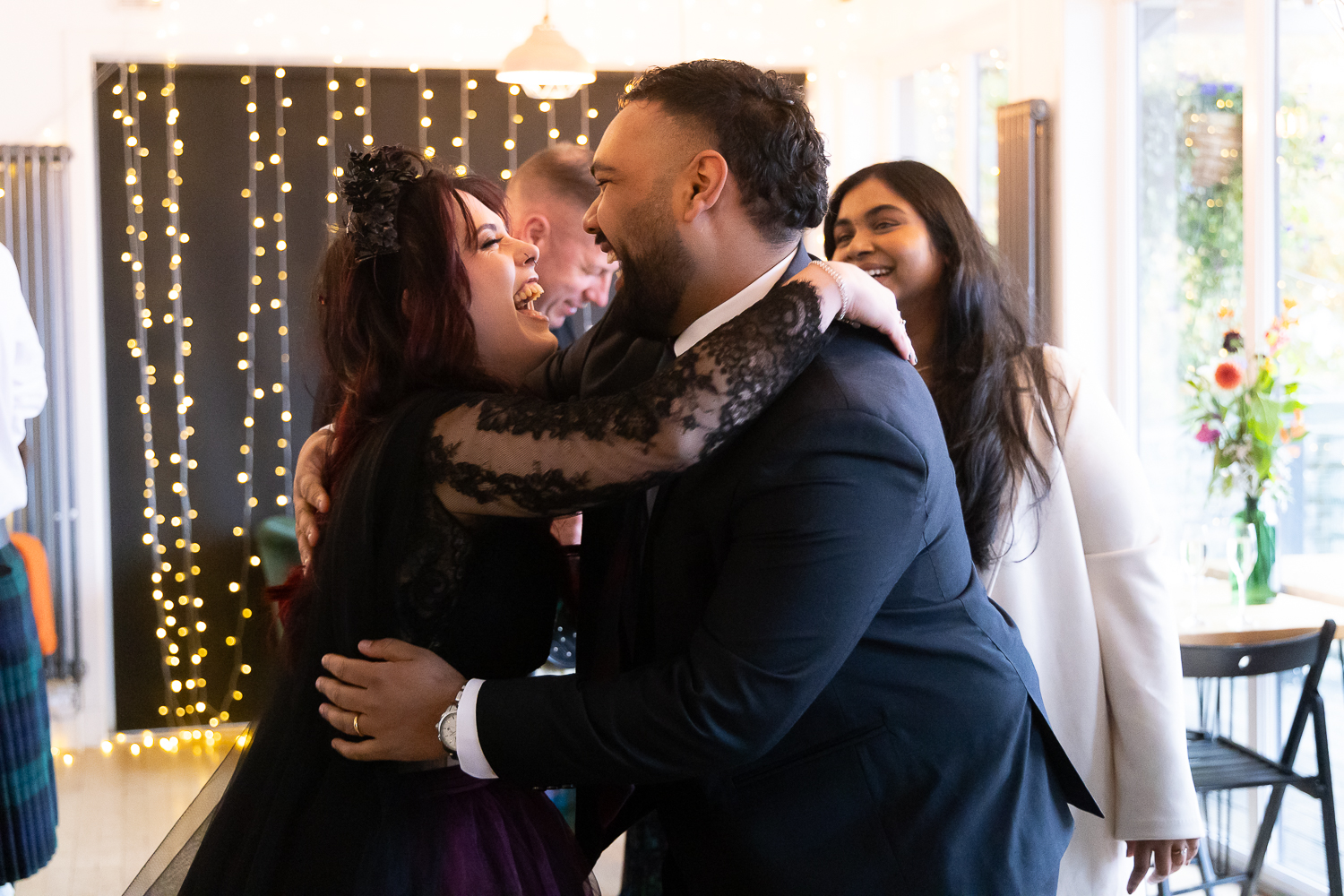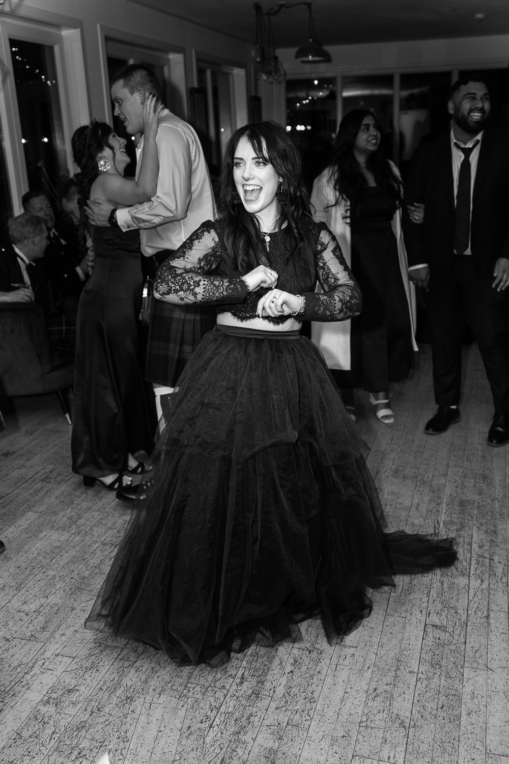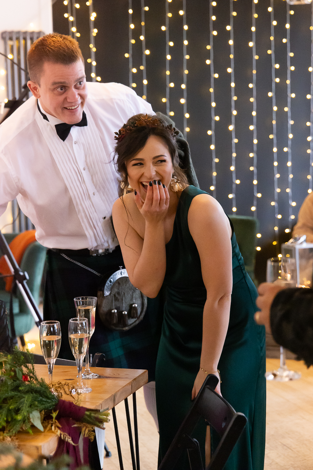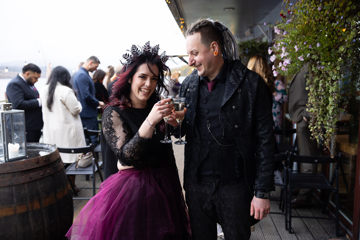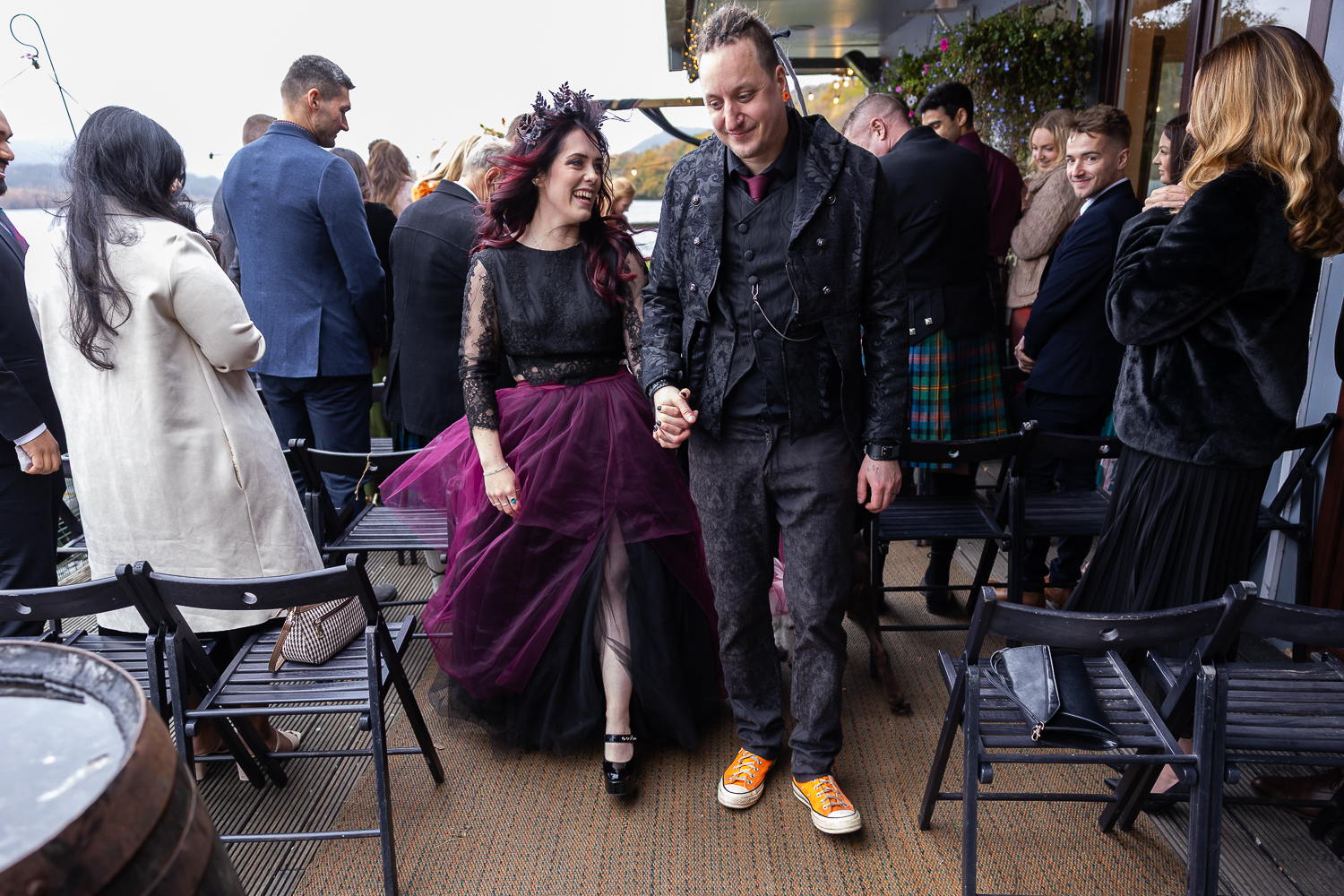 Their ceremony took place on the veranda overlooking Loch Venachar. The weather had that classic Scottish drama; crisp air and strong winds coming across the water but it only added to the energy and emotion of the moment. Meigan’s dress moved beautifully in the wind, Tomas couldn’t stop smiling, and the loch behind them created a constantly shifting backdrop of light and texture.
