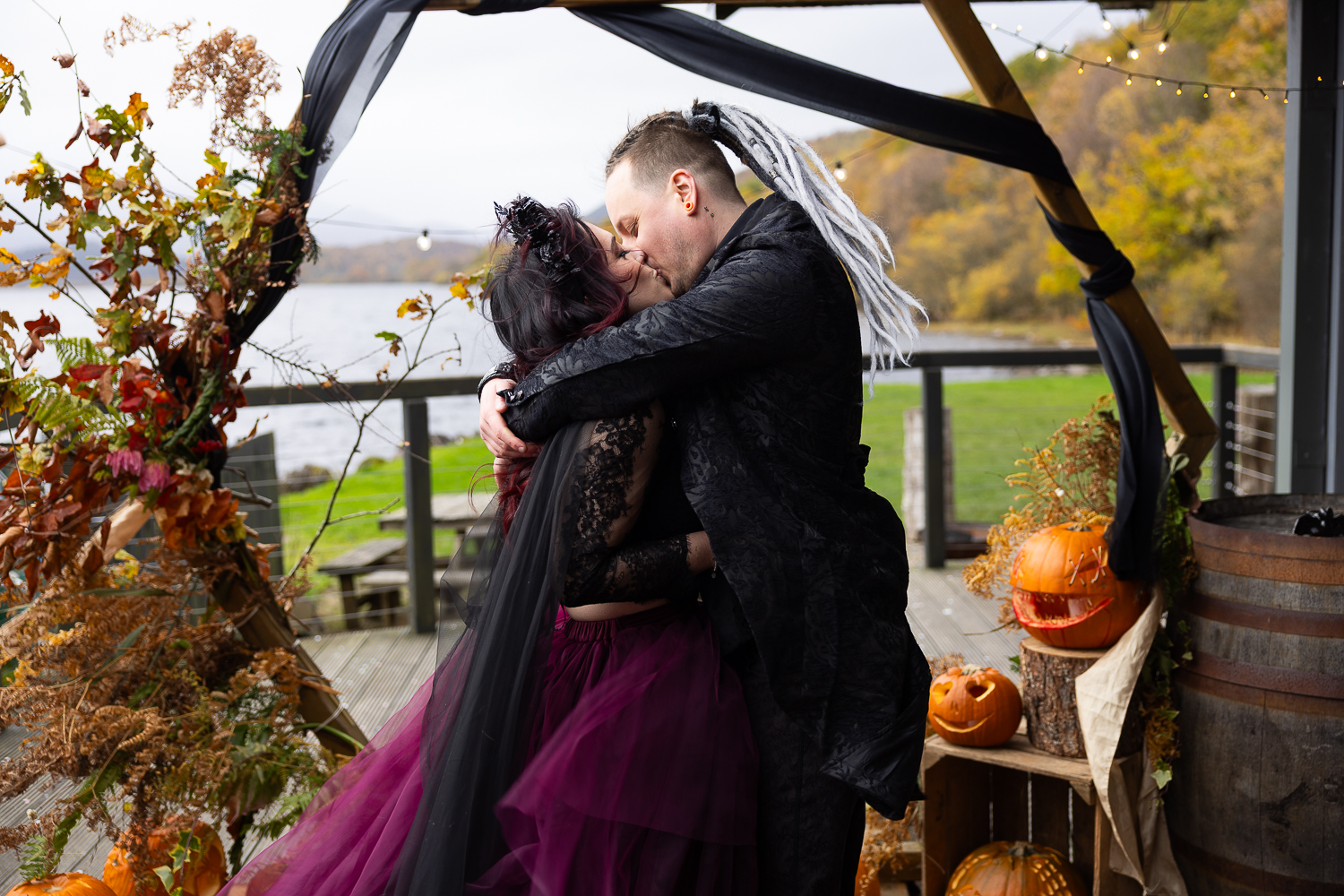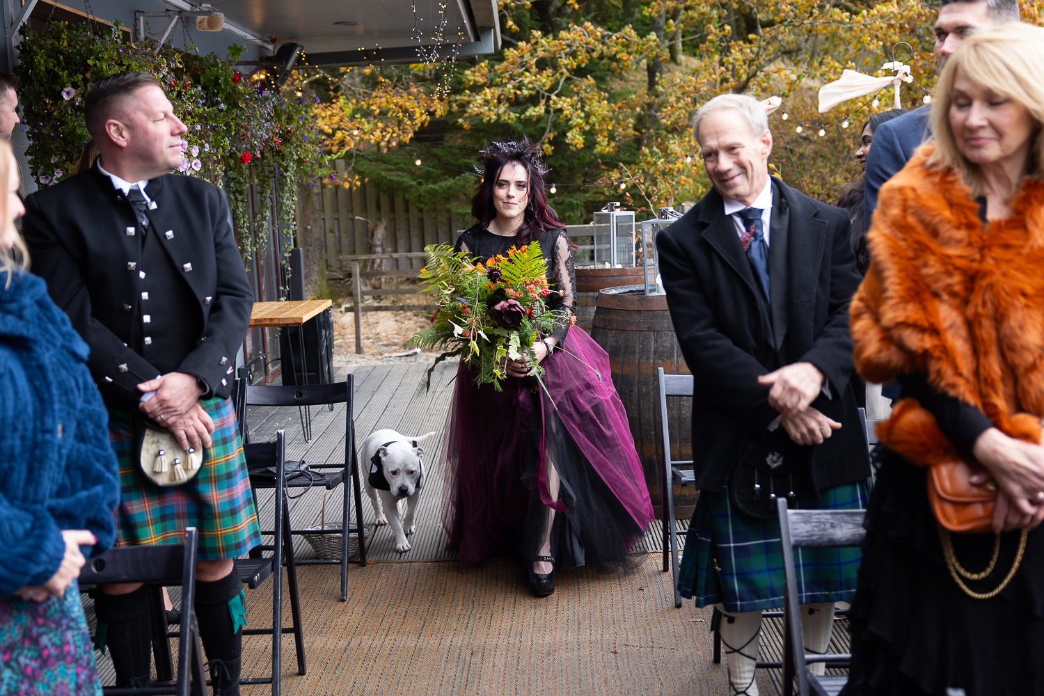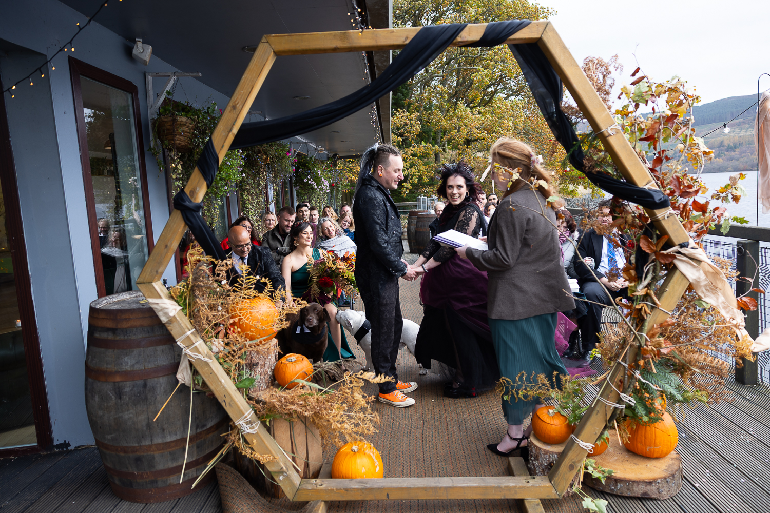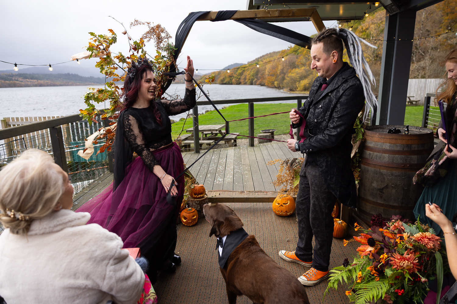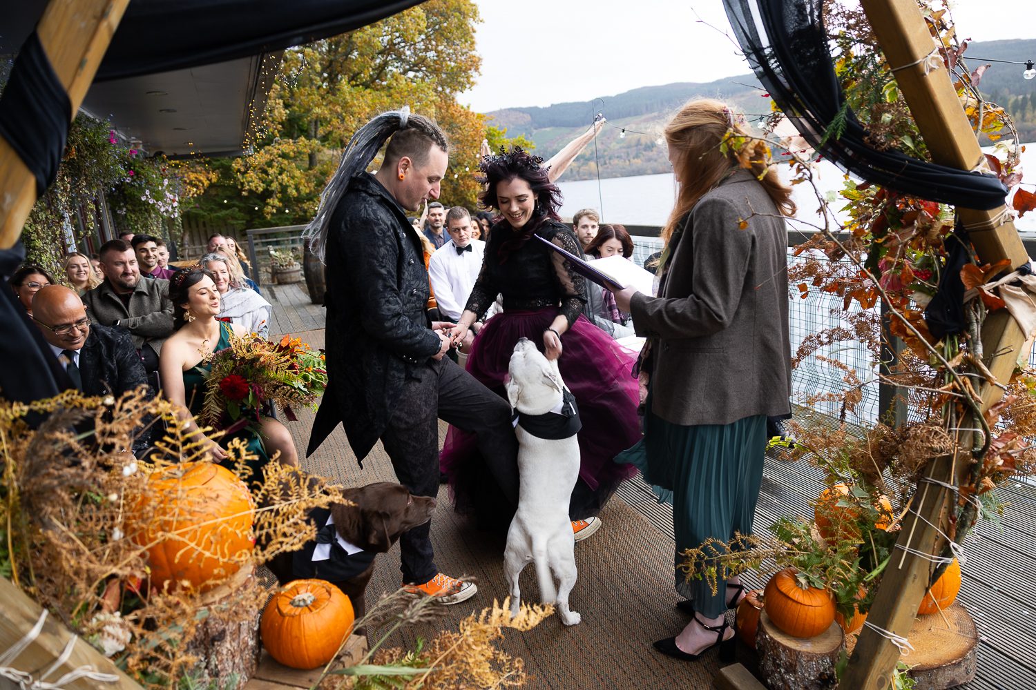 M & T’s day was the perfect example of why couples choose Venachar Lochside in autumn. Lochside vows, seasonal styling with pumpkin details and quiet woodland portraits created a wedding gallery full of depth, texture and story. From a quiet autumn ceremony, walking the dogs in the woodland to full-volume evening celebrations, the day had everything.
