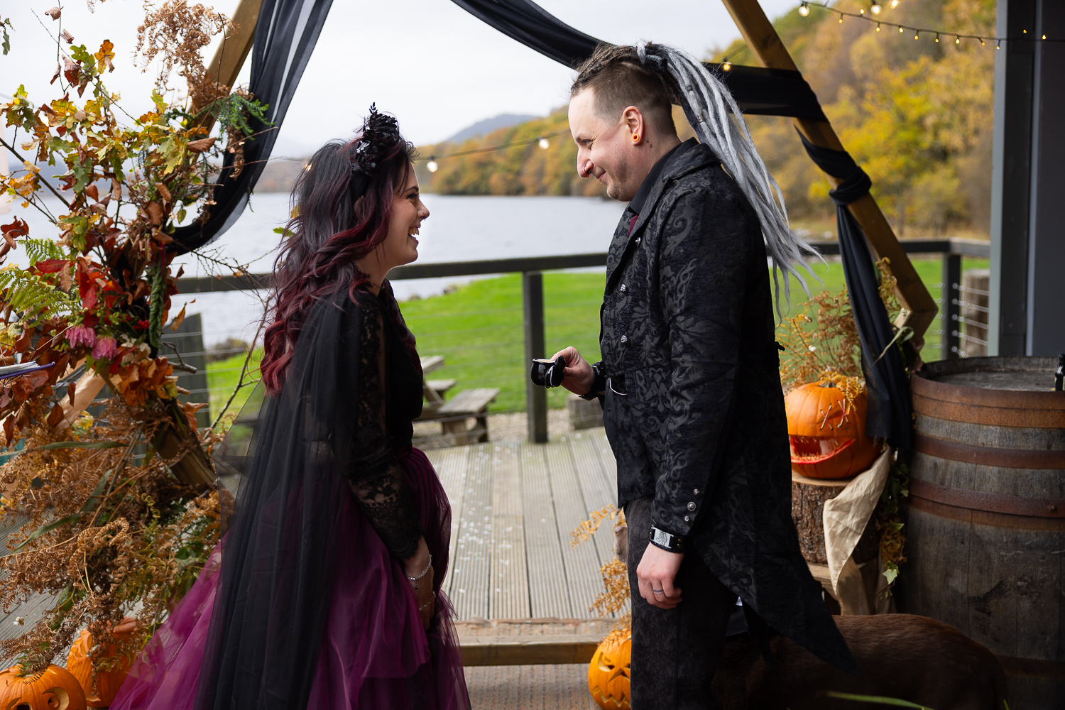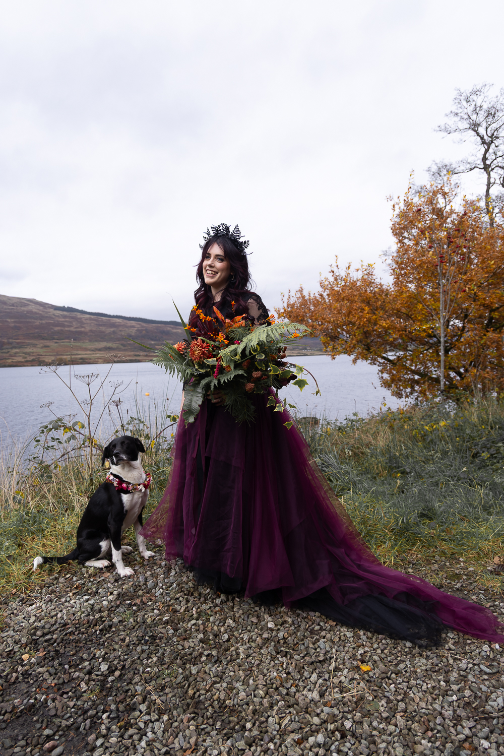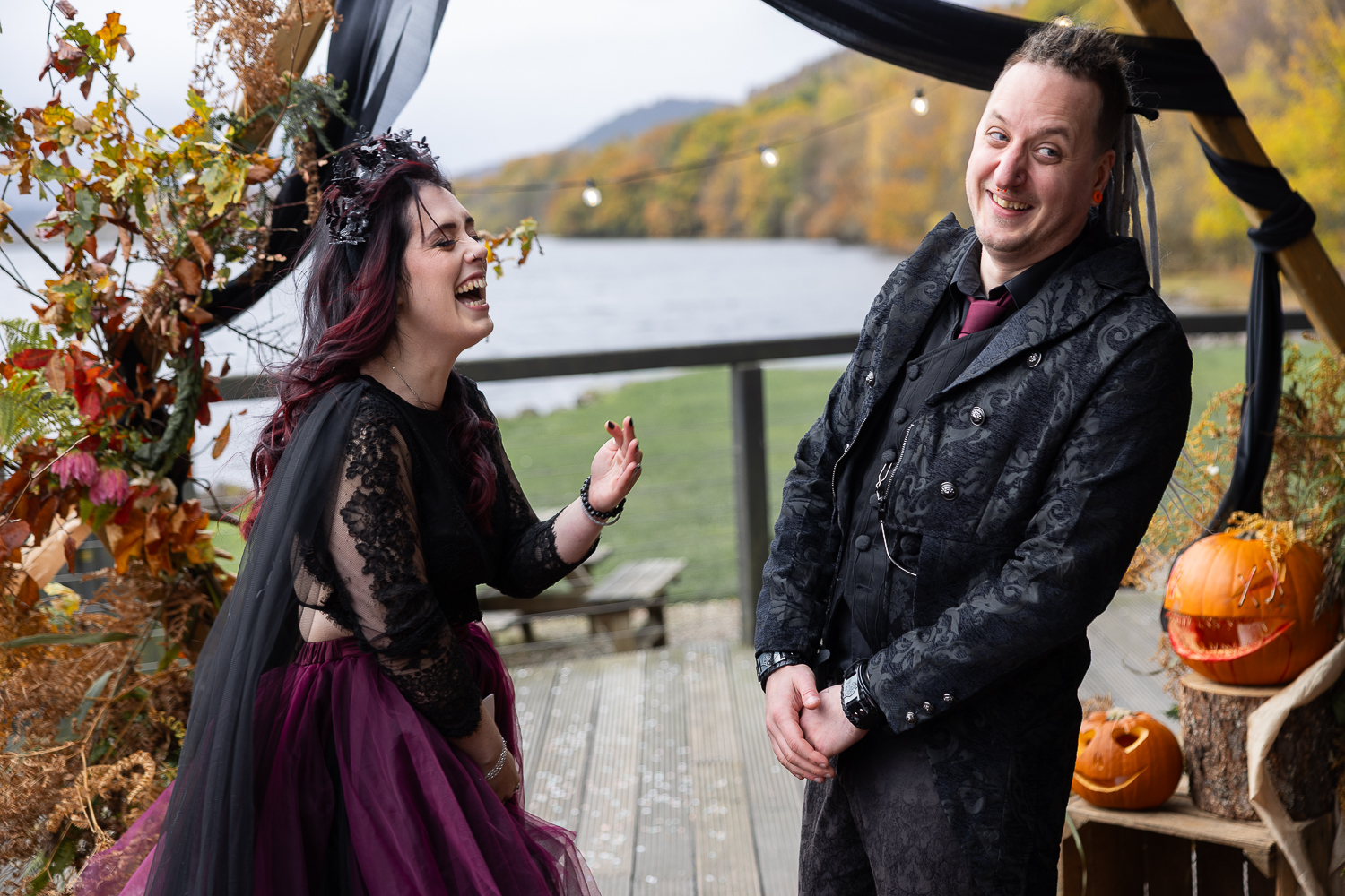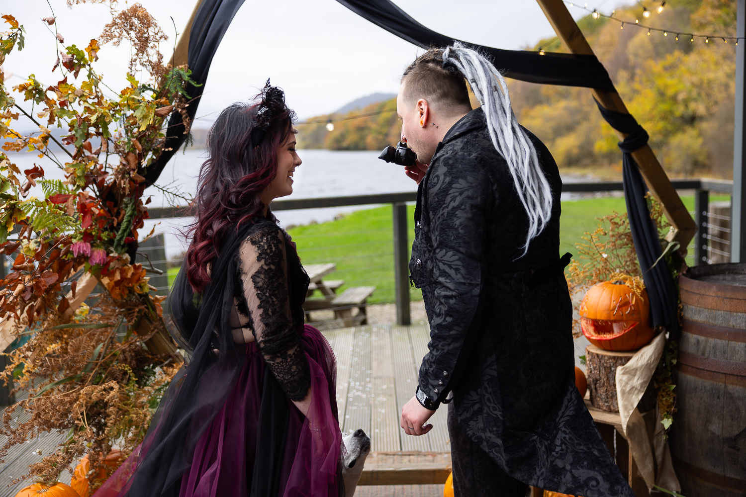 M & T’s day was the perfect example of why couples choose Venachar Lochside in autumn. Lochside vows, seasonal styling with pumpkin details and quiet woodland portraits created a wedding gallery full of depth, texture and story. From a quiet autumn ceremony, walking the dogs in the woodland to full-volume evening celebrations, the day had everything.