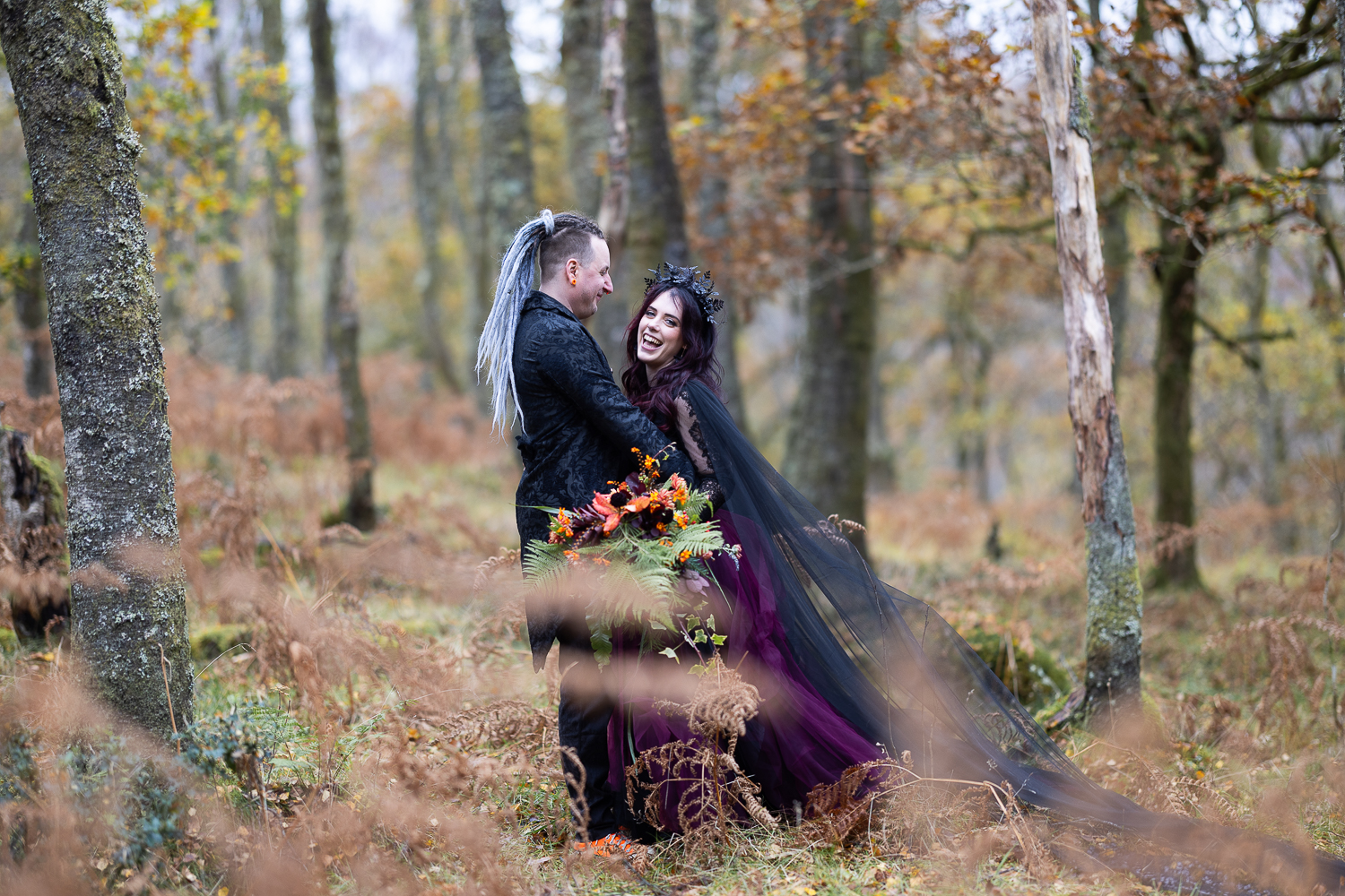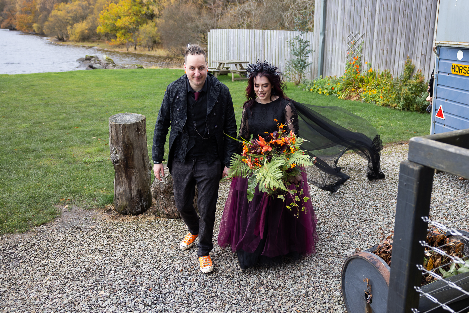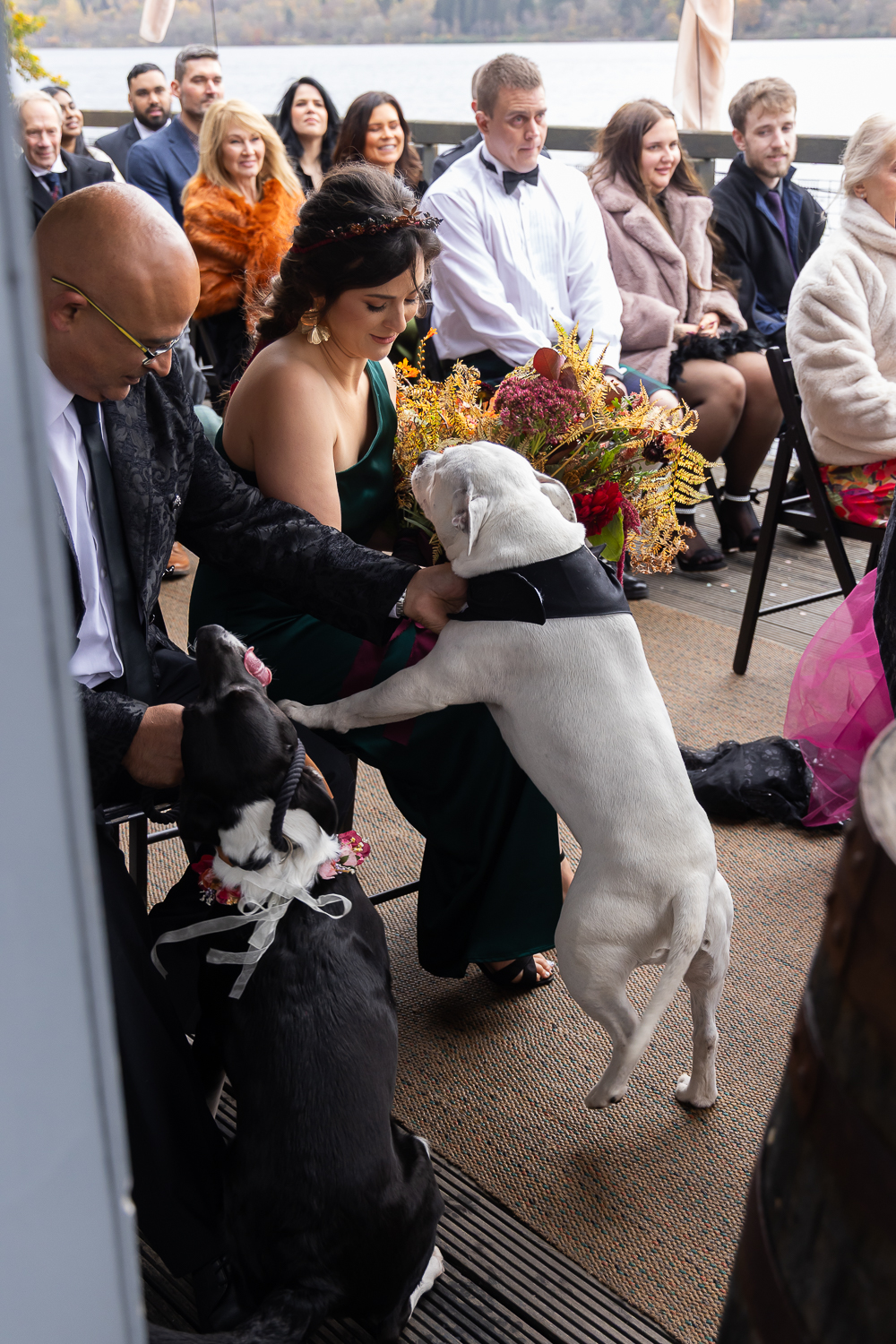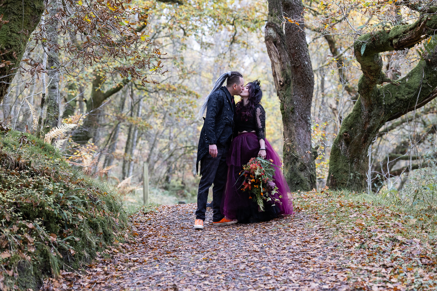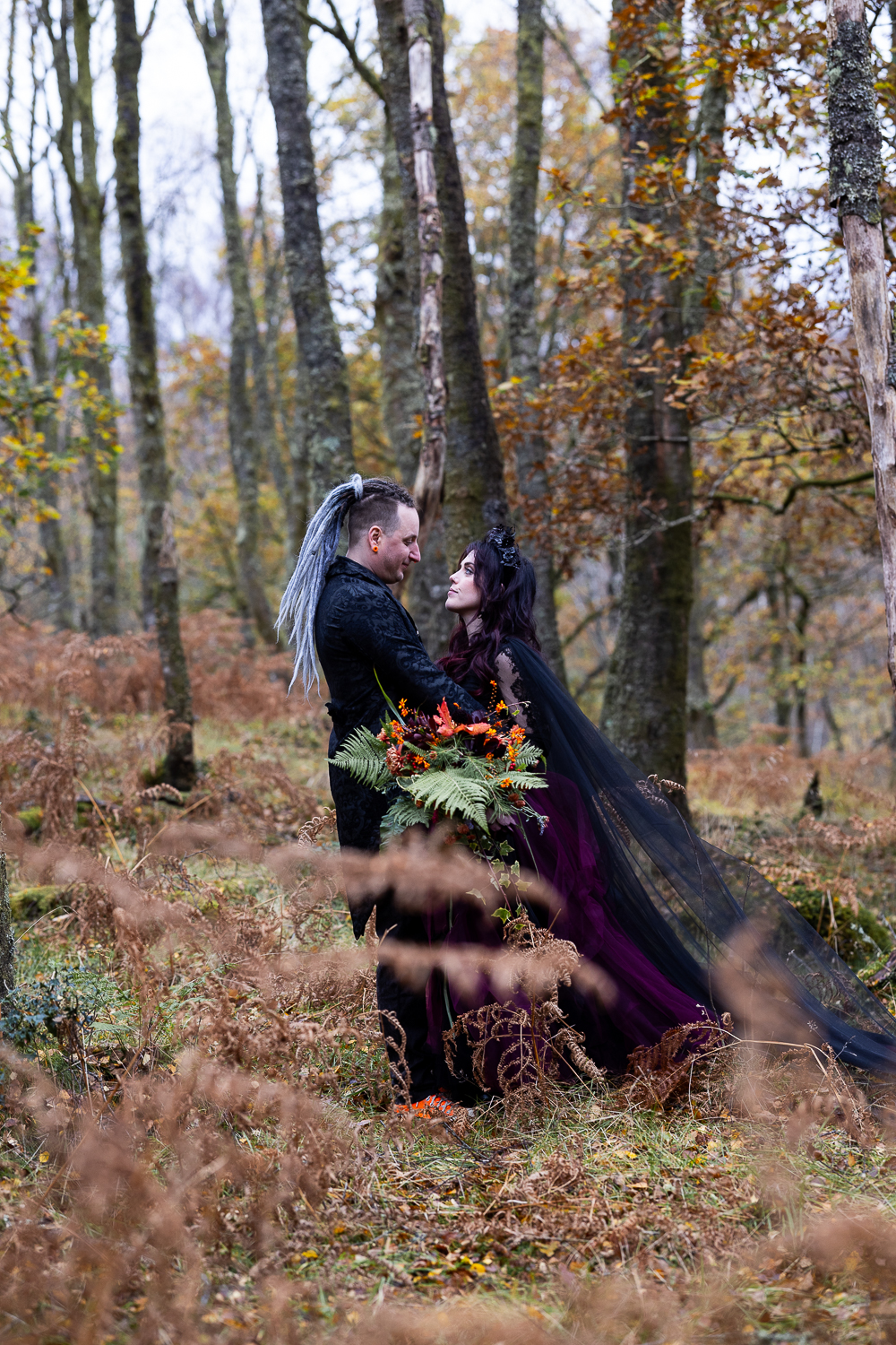 M & T’s day was the perfect example of why couples choose Venachar Lochside in autumn. Lochside vows, seasonal styling with pumpkin details and quiet woodland portraits created a wedding gallery full of depth, texture and story. From a quiet autumn ceremony, walking the dogs in the woodland to full-volume evening celebrations, the day had everything.