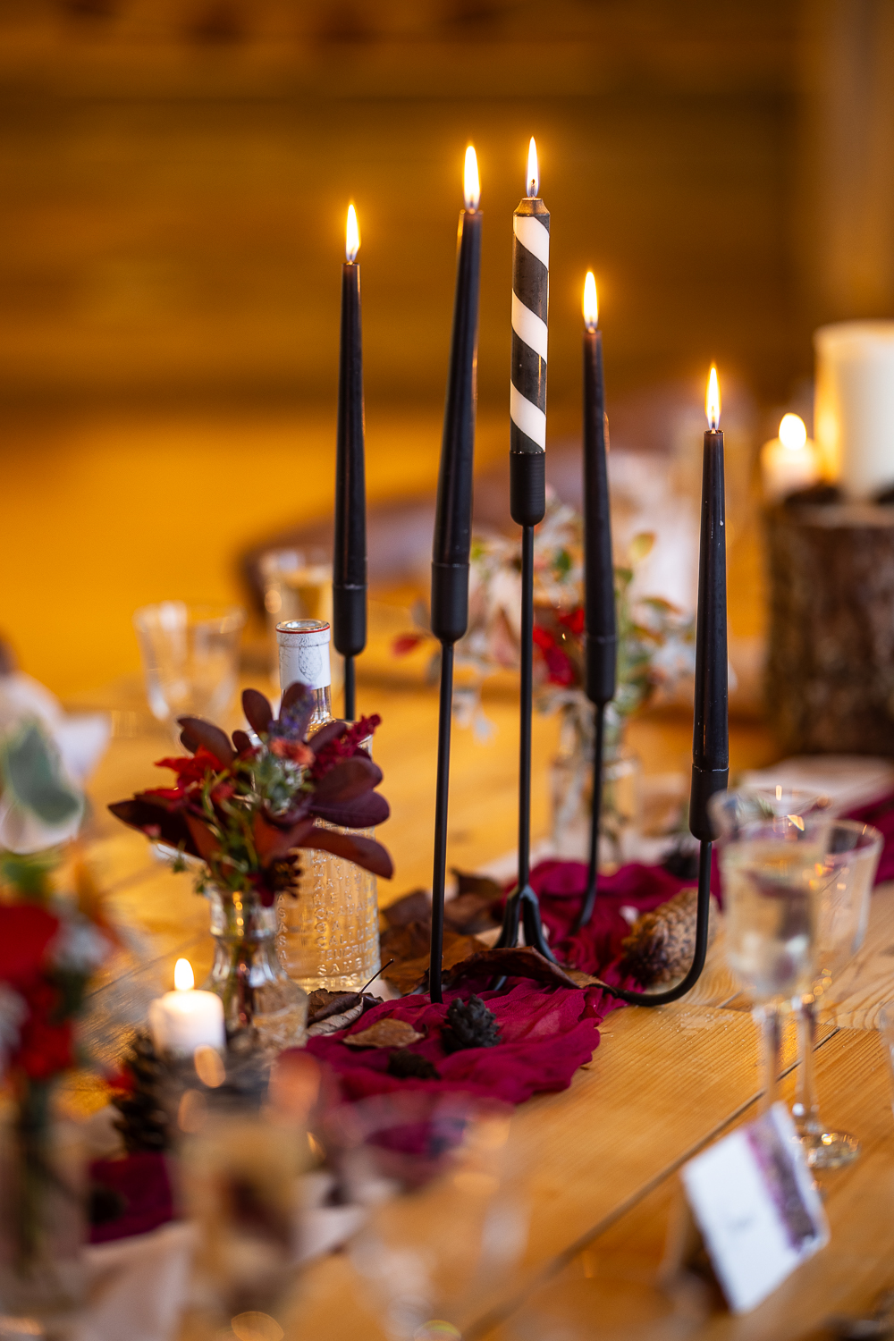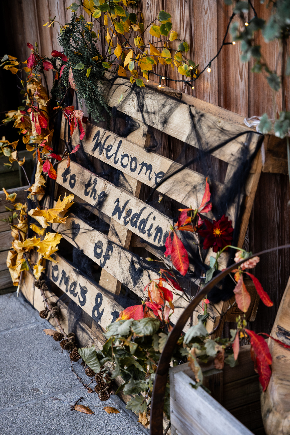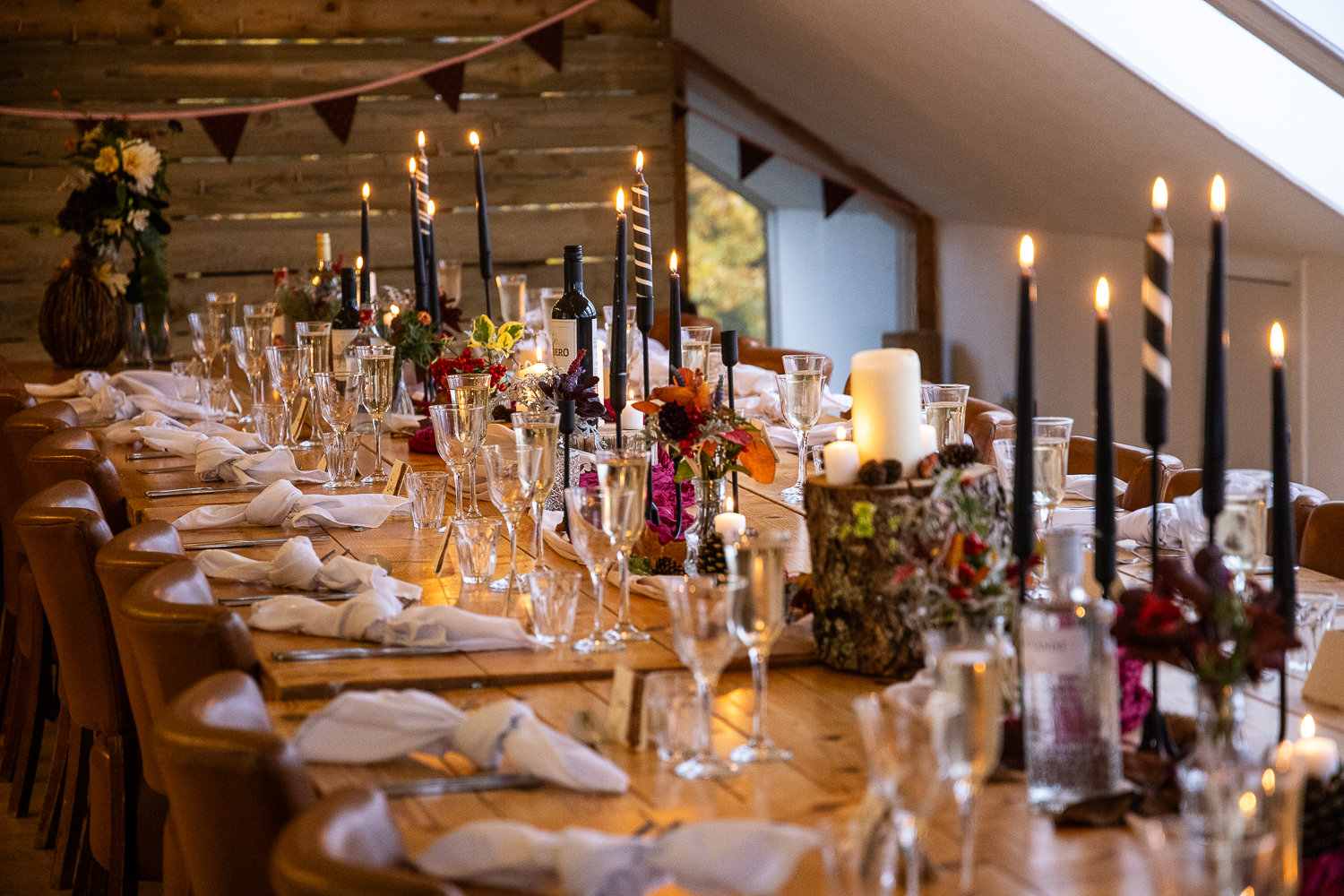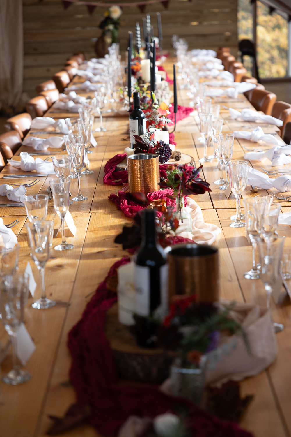 The couple chose to lean fully into the season, building a warm, rustic aesthetic that complemented the landscape rather than competing with it.