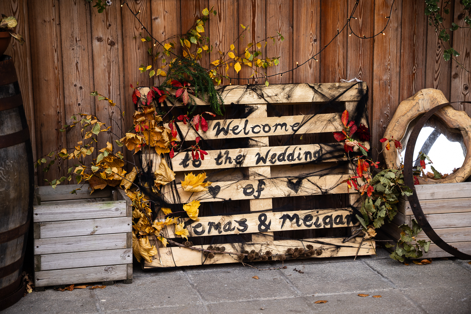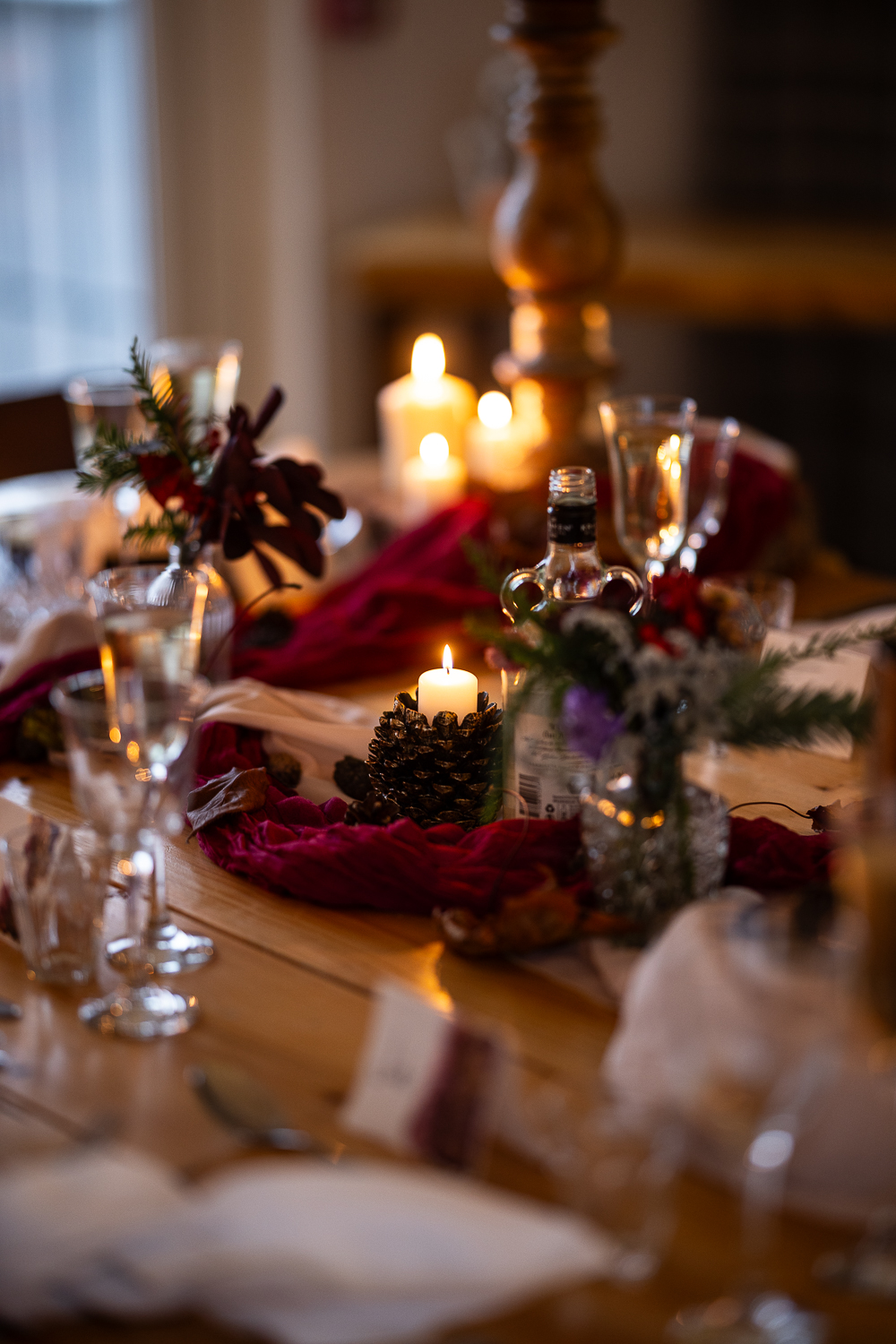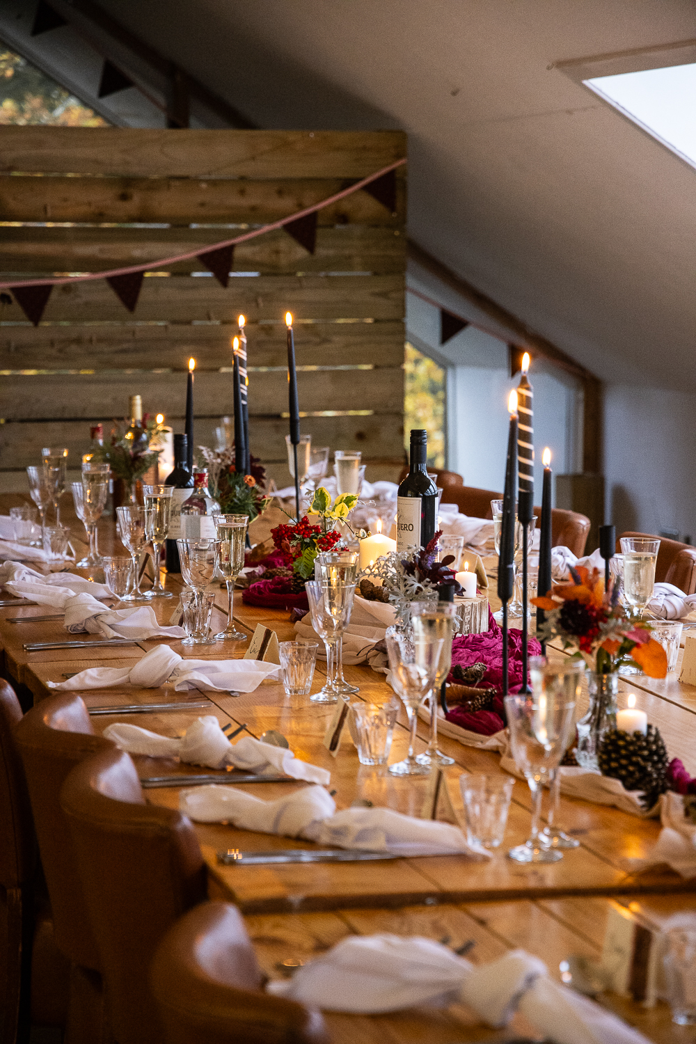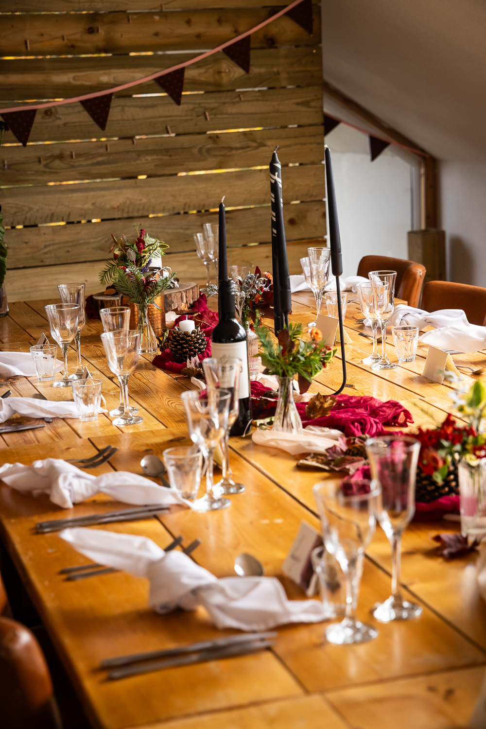 The couple chose to lean fully into the season, building a warm, rustic aesthetic that complemented the landscape rather than competing with it.