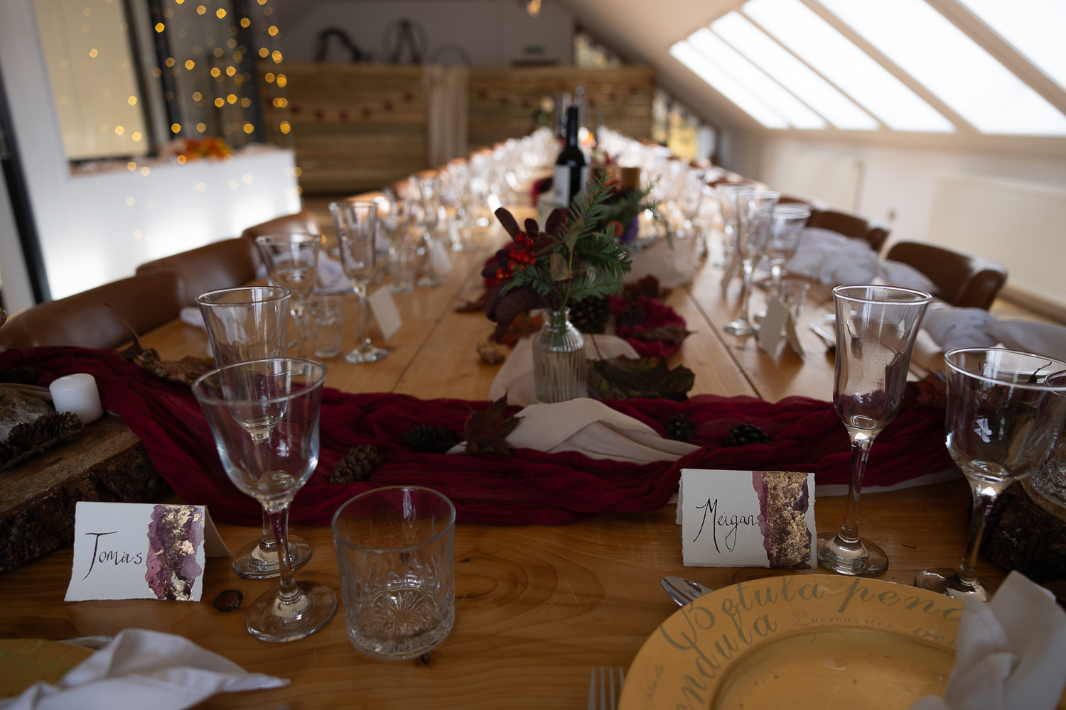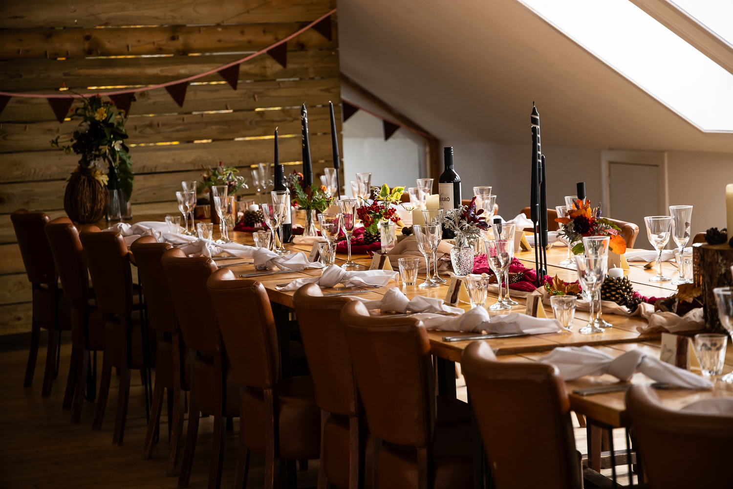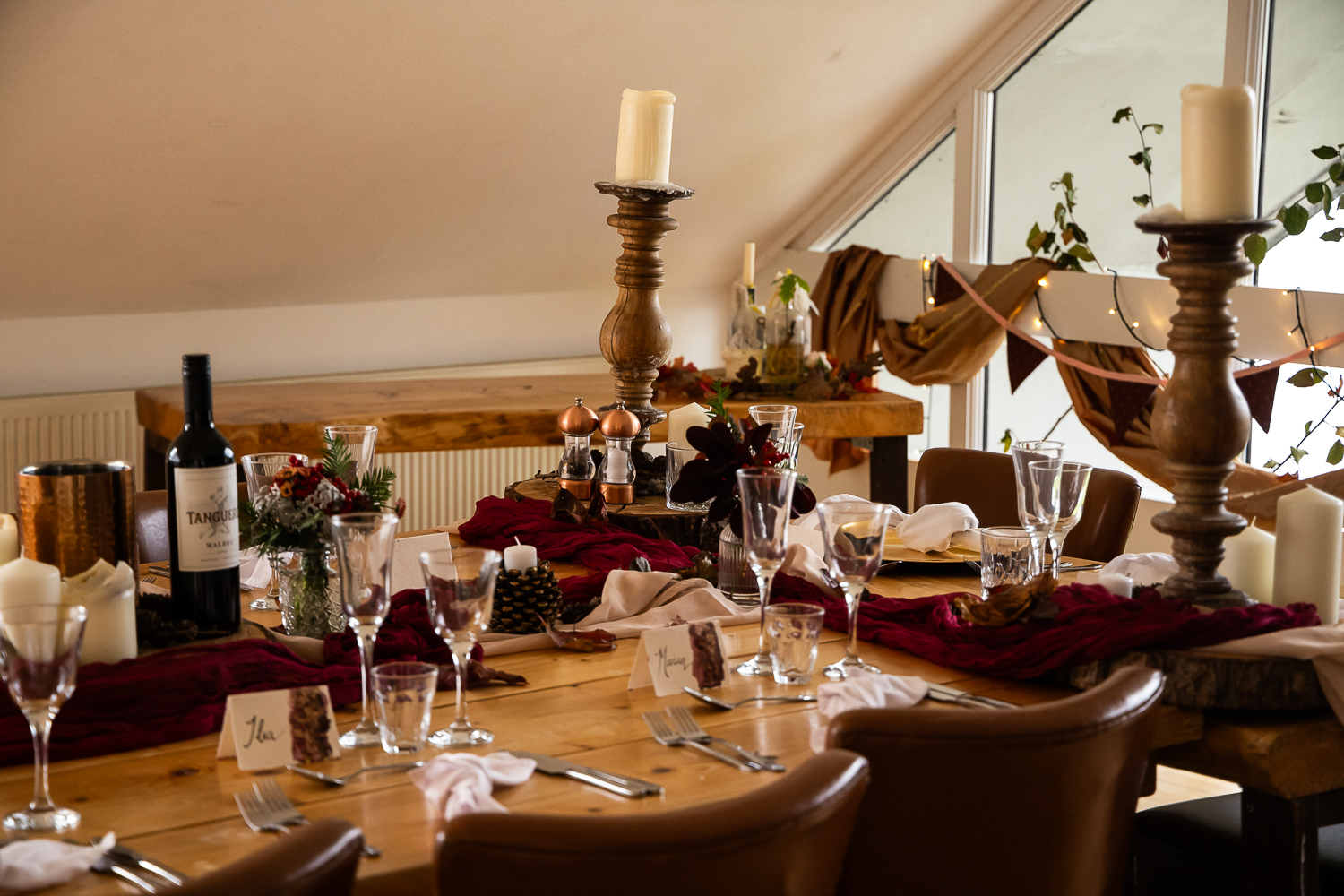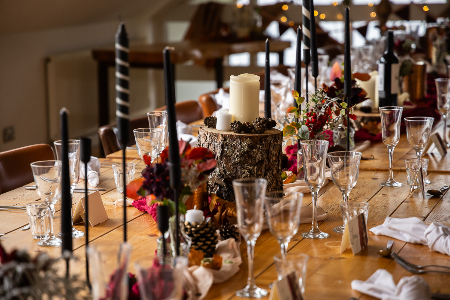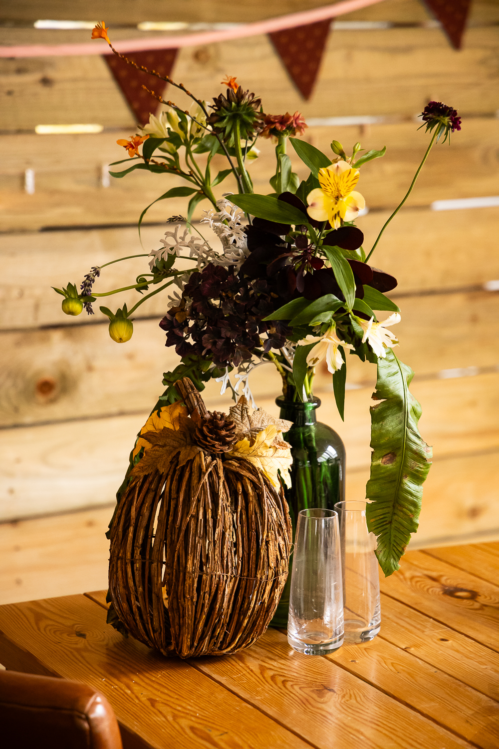 The couple chose to lean fully into the season, building a warm, rustic aesthetic that complemented the landscape rather than competing with it.