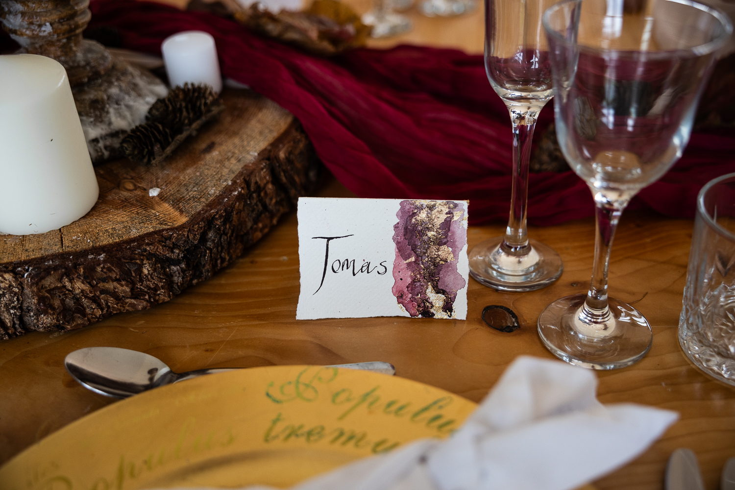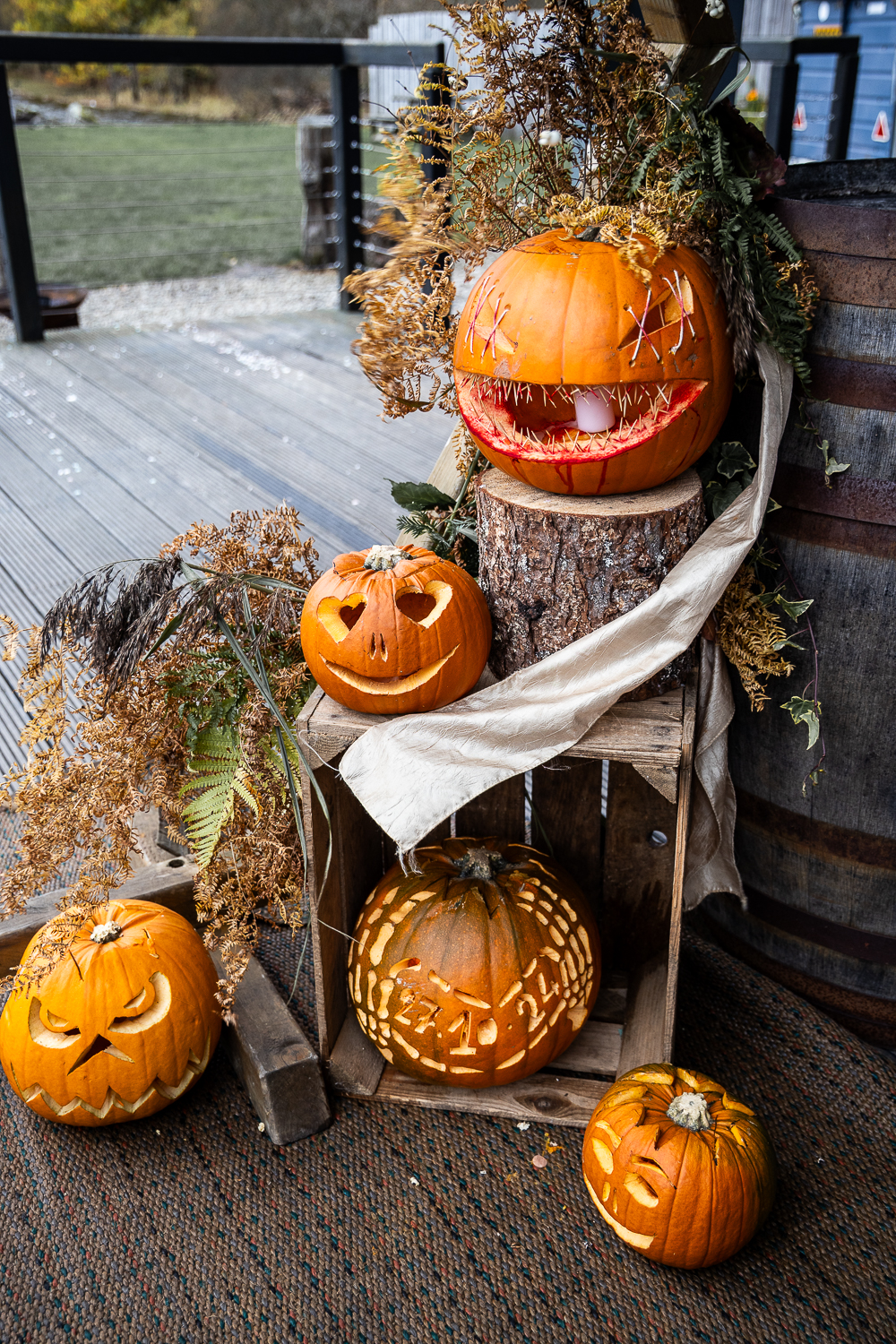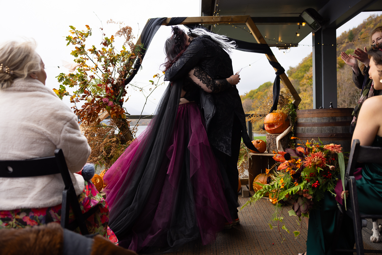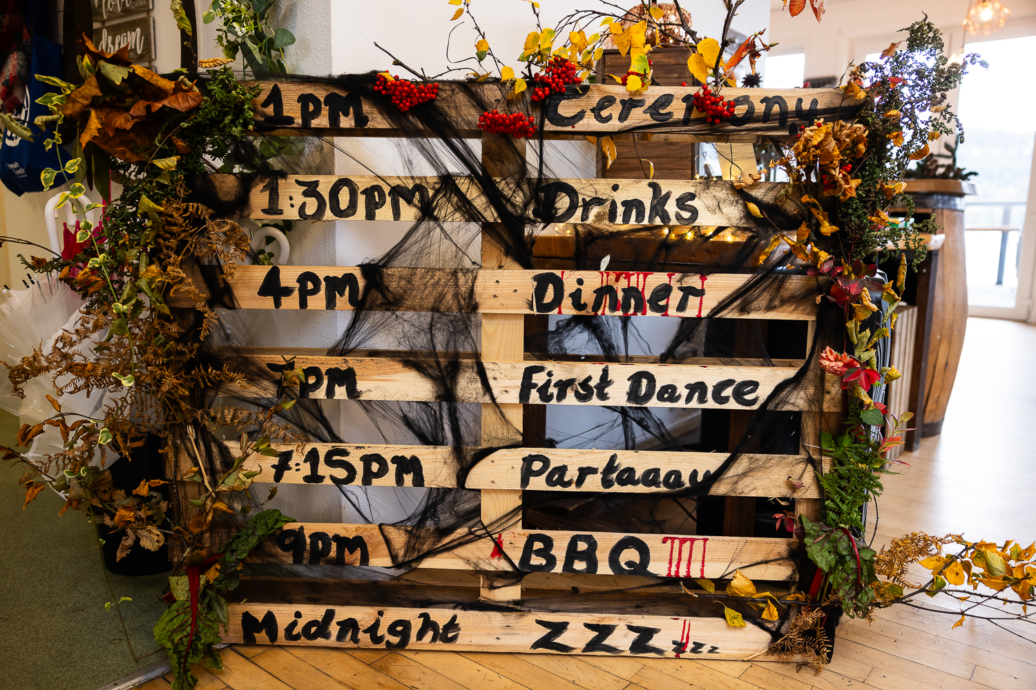 The couple chose to lean fully into the season, building a warm, rustic aesthetic that complemented the landscape rather than competing with it.