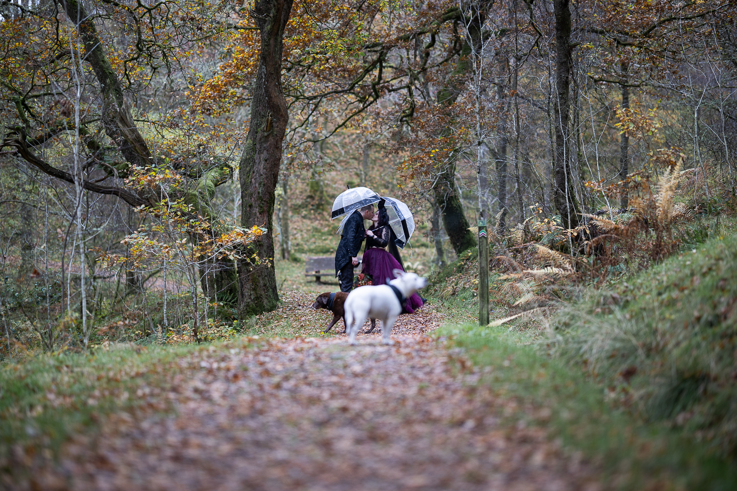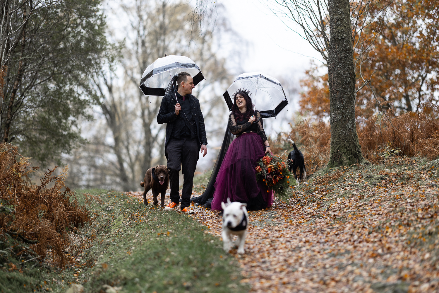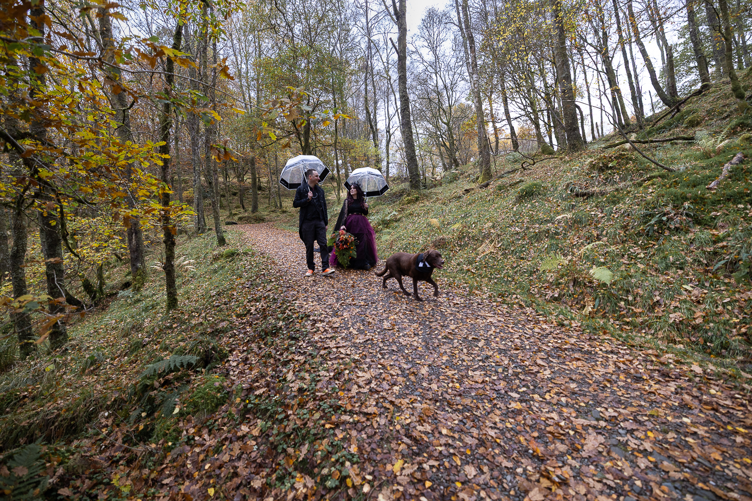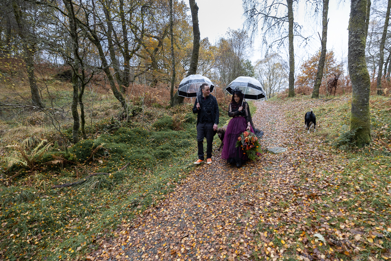 long shot of wedding couple walking with umbrellas and their dogs in the woods at venachar
