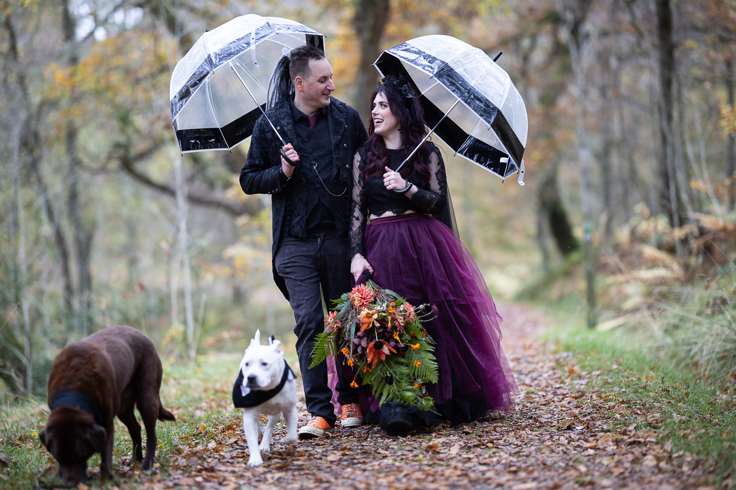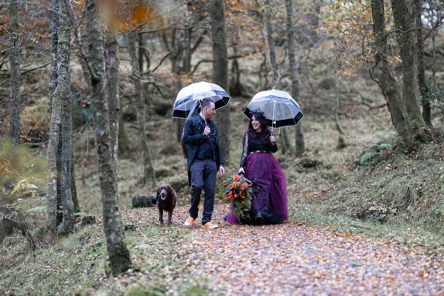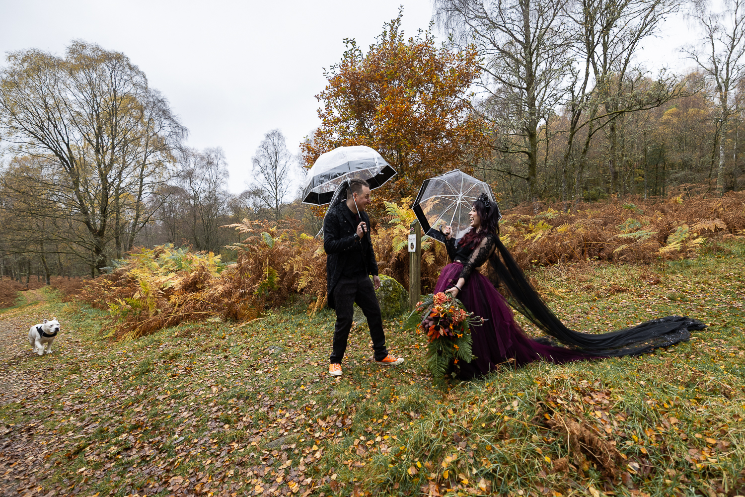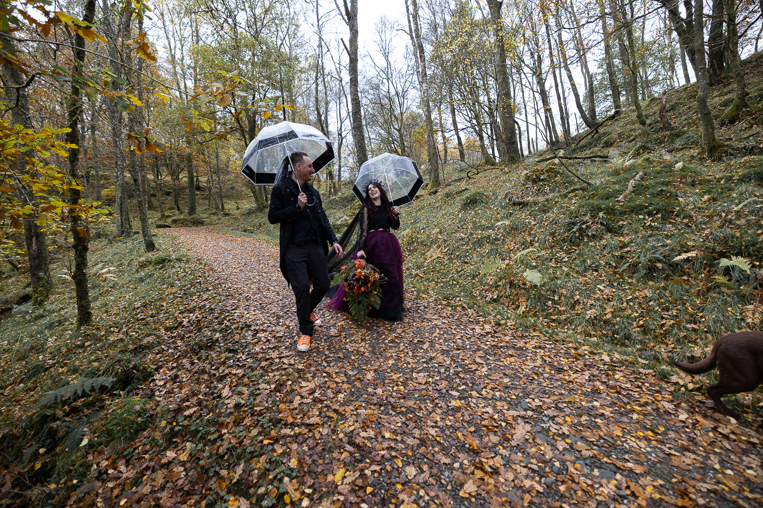 long shot of wedding couple walking with umbrellas and their dogs in the woods at venachar
