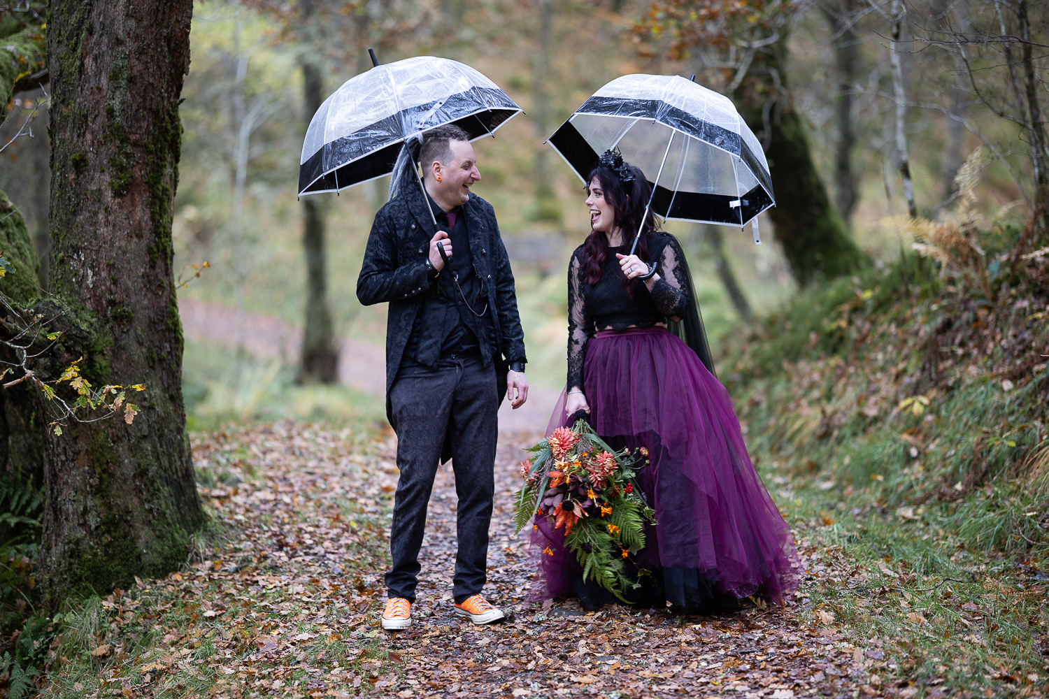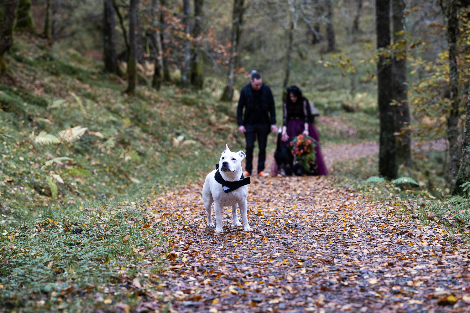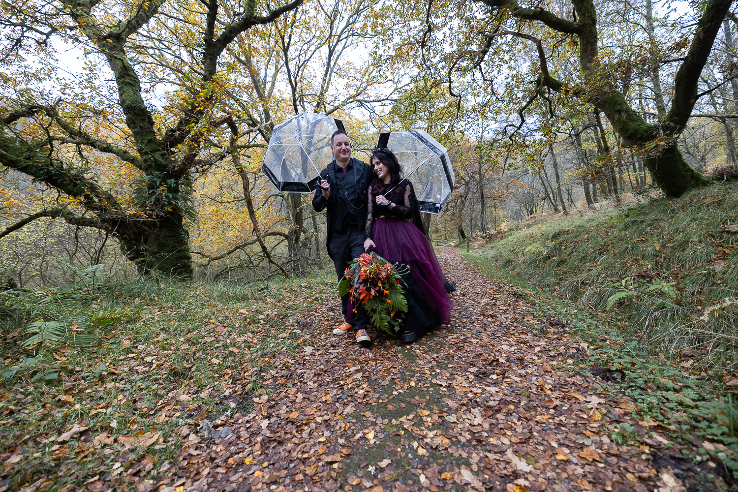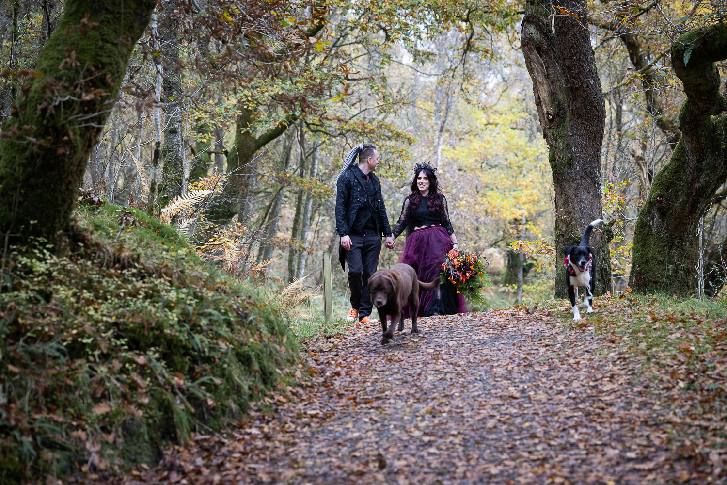 long shot of wedding couple walking with umbrellas and their dogs in the woods at venachar