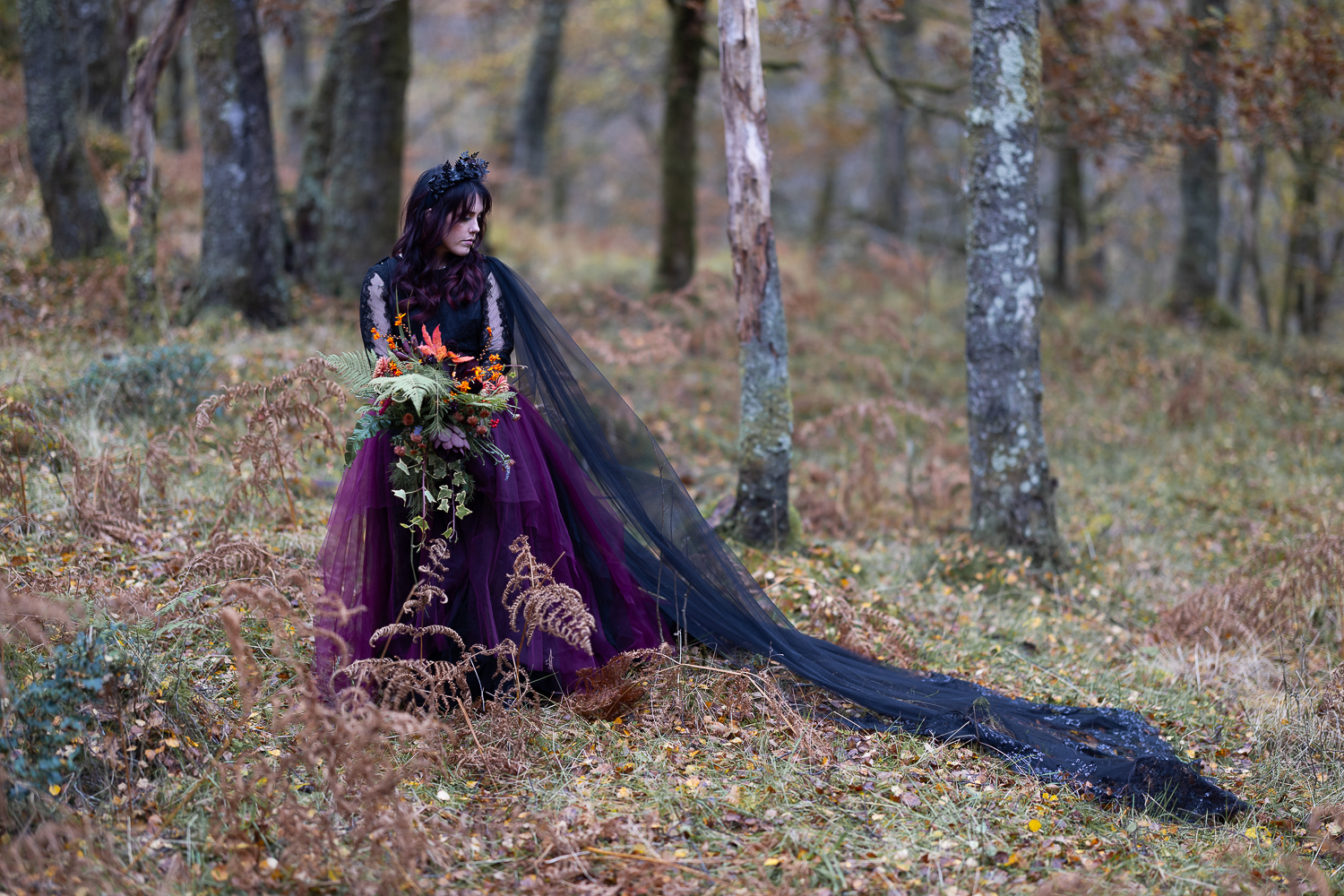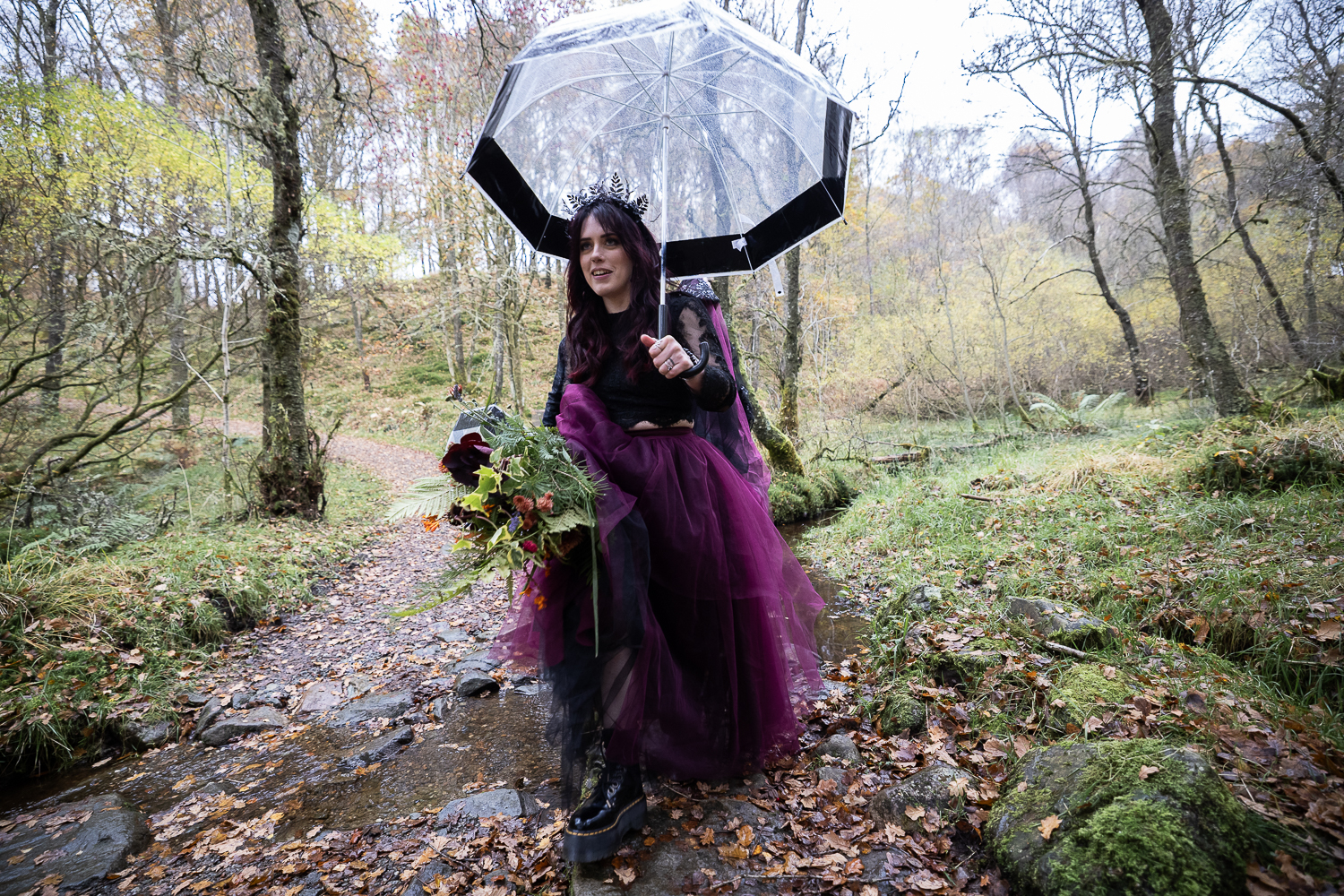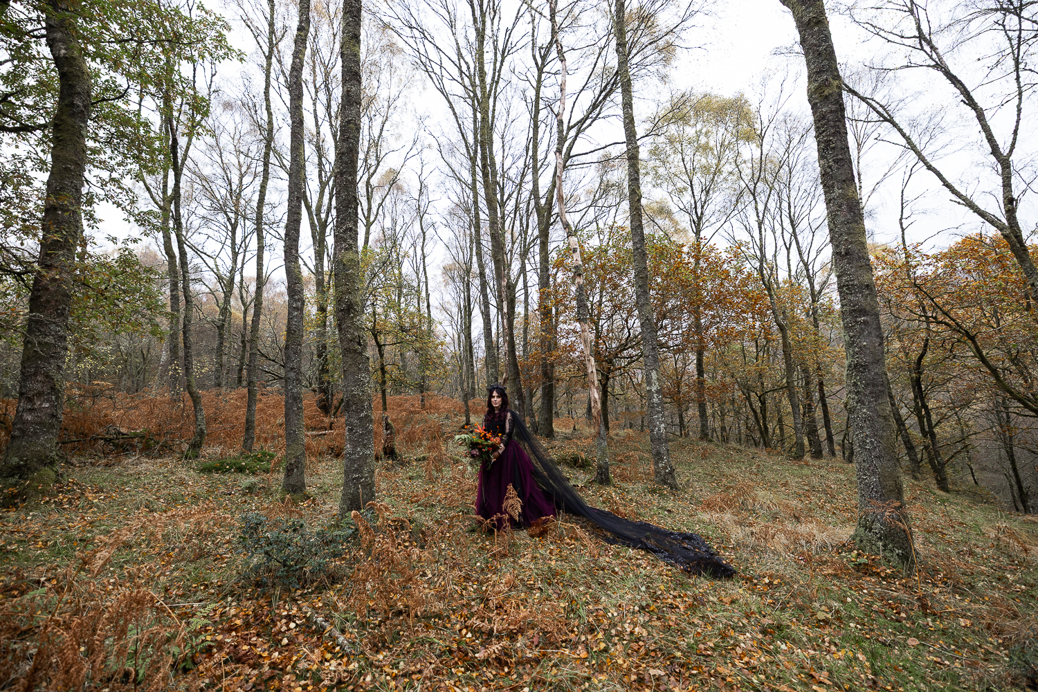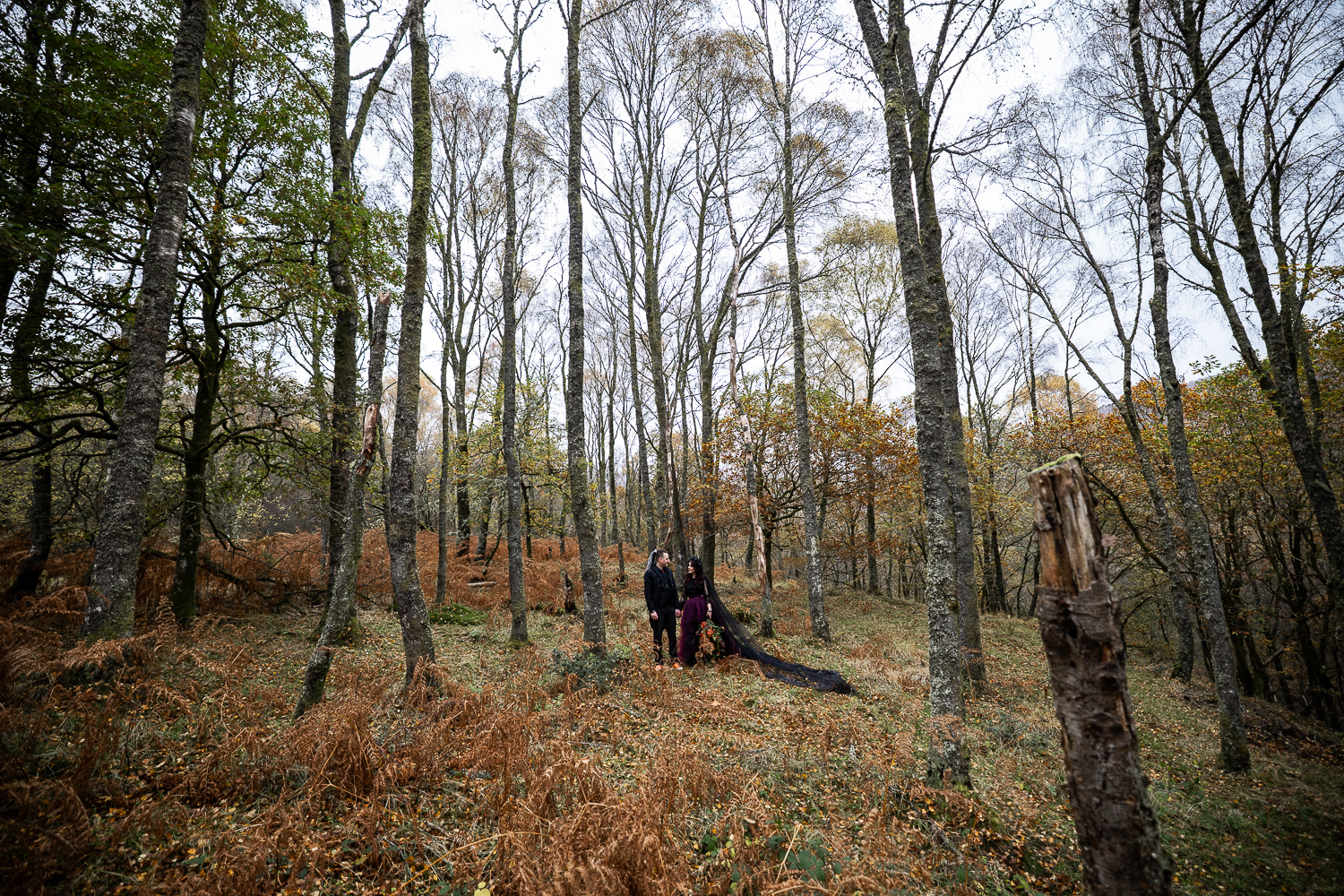 The mix of textures of rough bark, soft moss, fallen leaves and flowing fabric  created depth and warmth in every frame. The contrast between the open lochside ceremony and the enclosed woodland portraits gave their gallery a complete storytelling arc.
