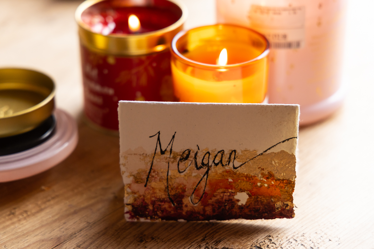 • Warm candlelight and copper tones