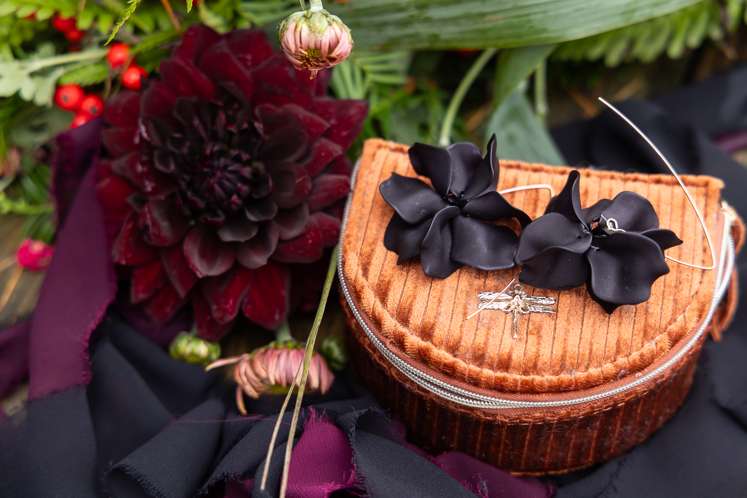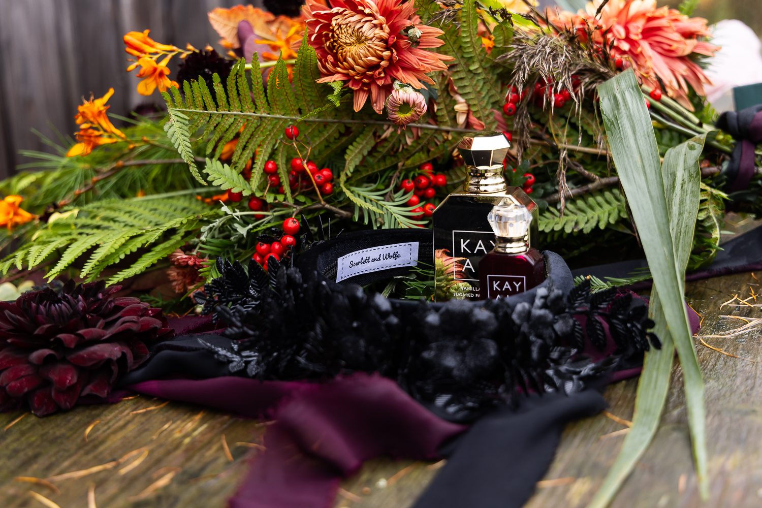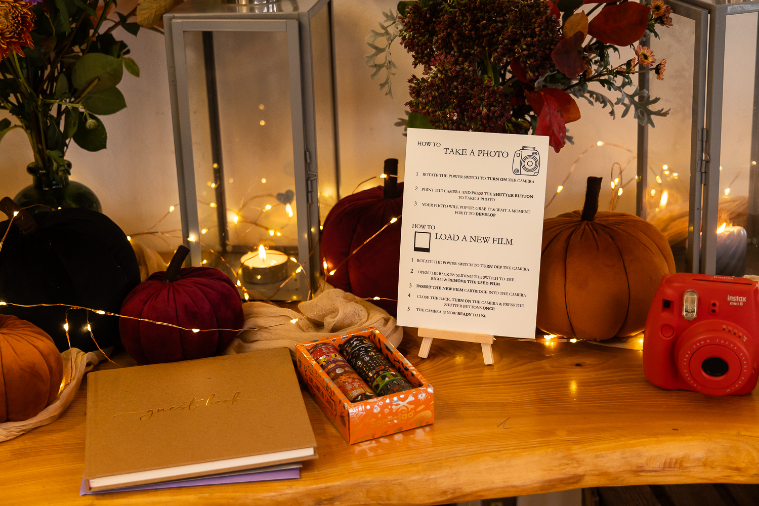 The wooden textures, cosy interiors, and autumn styling details created a storytelling, rich environment. Pumpkin details were woven through the wedding styling, appearing in decor, flat lays, and preparation spaces, tying the whole autumn theme together.