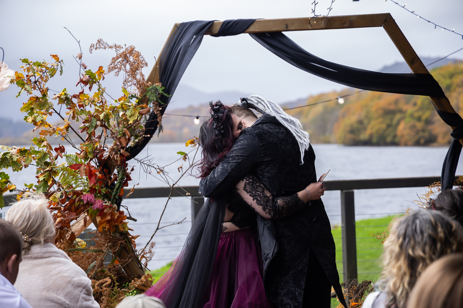 Autumn weddings at Venachar Lochside have a way of feeling both intimate and cinematic so Meigan & Tomas’s day was exactly that. Set against the still waters of Loch Venachar and surrounded by rich amber woodland tones, their wedding felt like stepping into a Scottish autumn fairytale, which is little surprising given Meigan’s choice of dress!